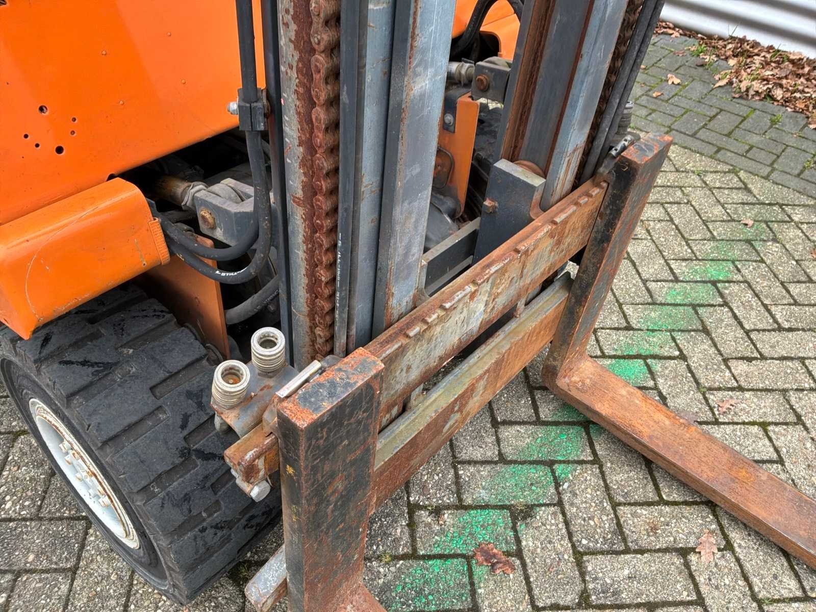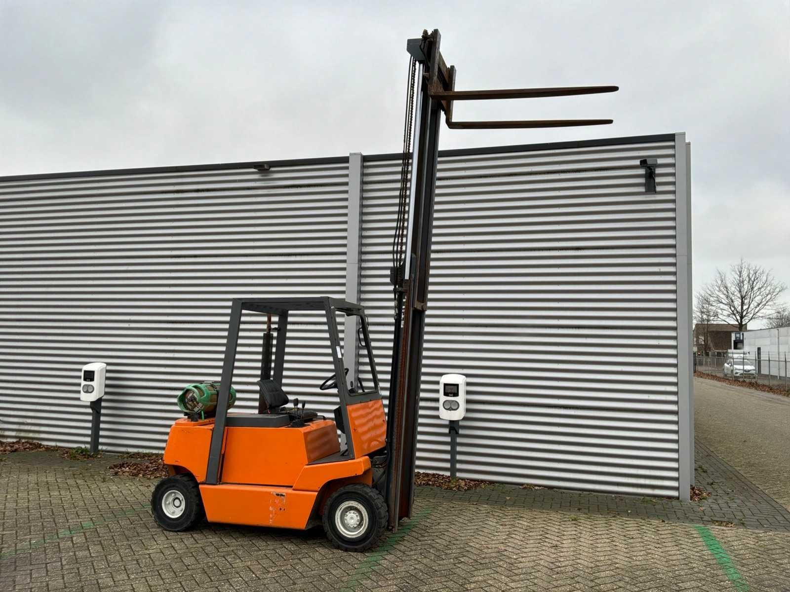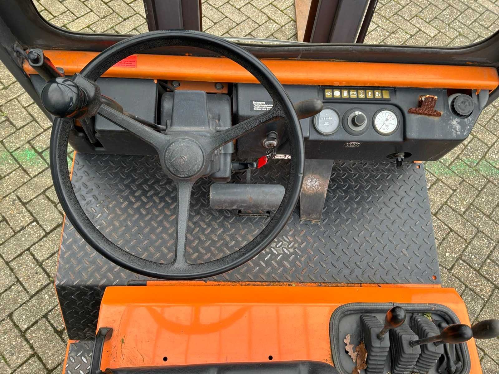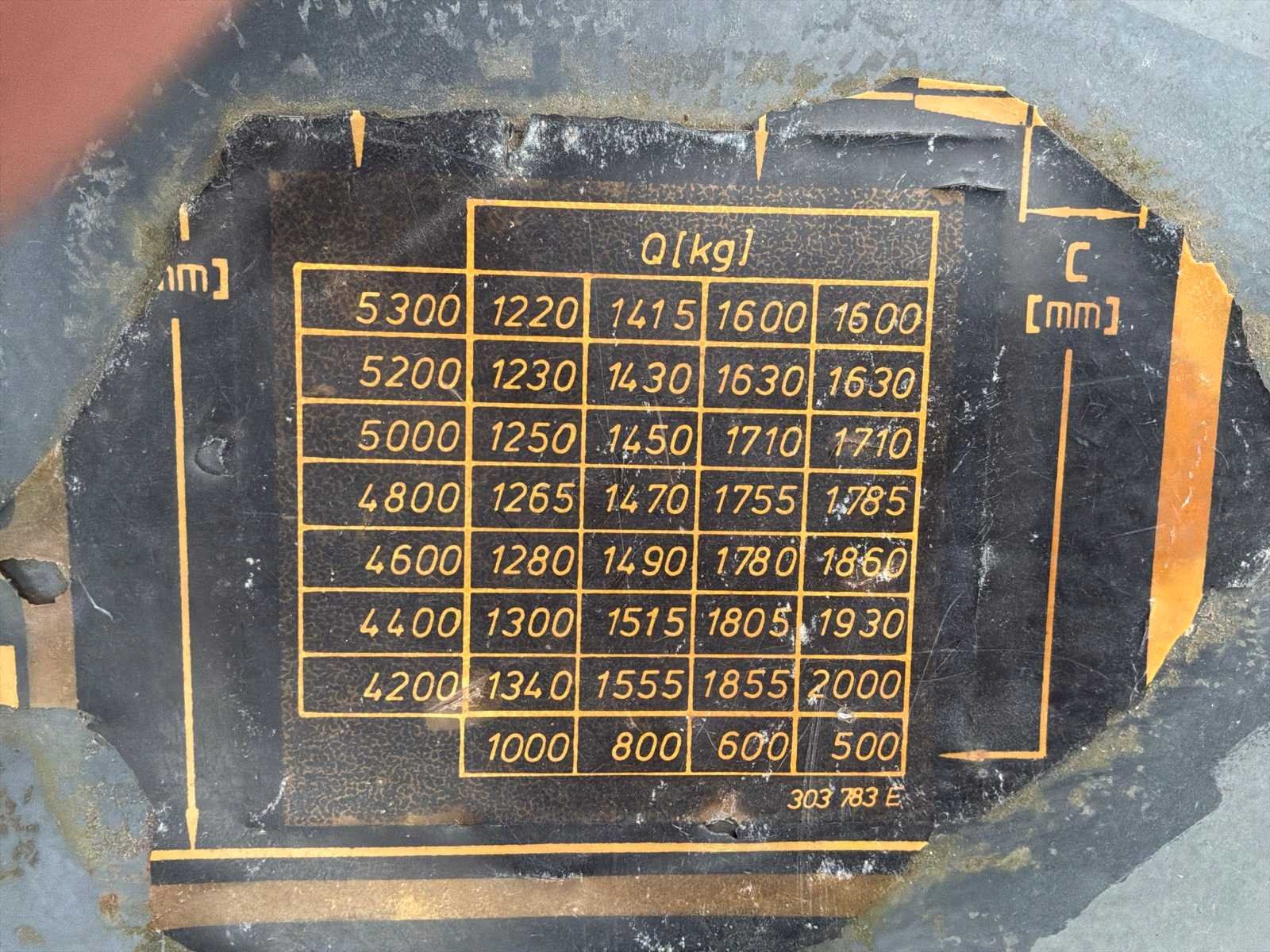 Zonder gasfles, sideshift hydraulische aansluiting Merk: Still Type: R70-20T Bouwjaar: 1991 Serienummer: 70180378 Brandstof: LPG Mast: Duplex Soort band: Volrubber banden Aantal wielen: 4 Eigen gewicht: 3500kg Lepellengte: 1150mm Max. hefhoogte: 5300mm Vol rubber banden: true Minimale doorrijhoogte: 2600mm Totale afmeting L: 4200mm Totale afmeting Breedte: 1170mm Totale afmeting Hoogte: 2600mm LPG: true