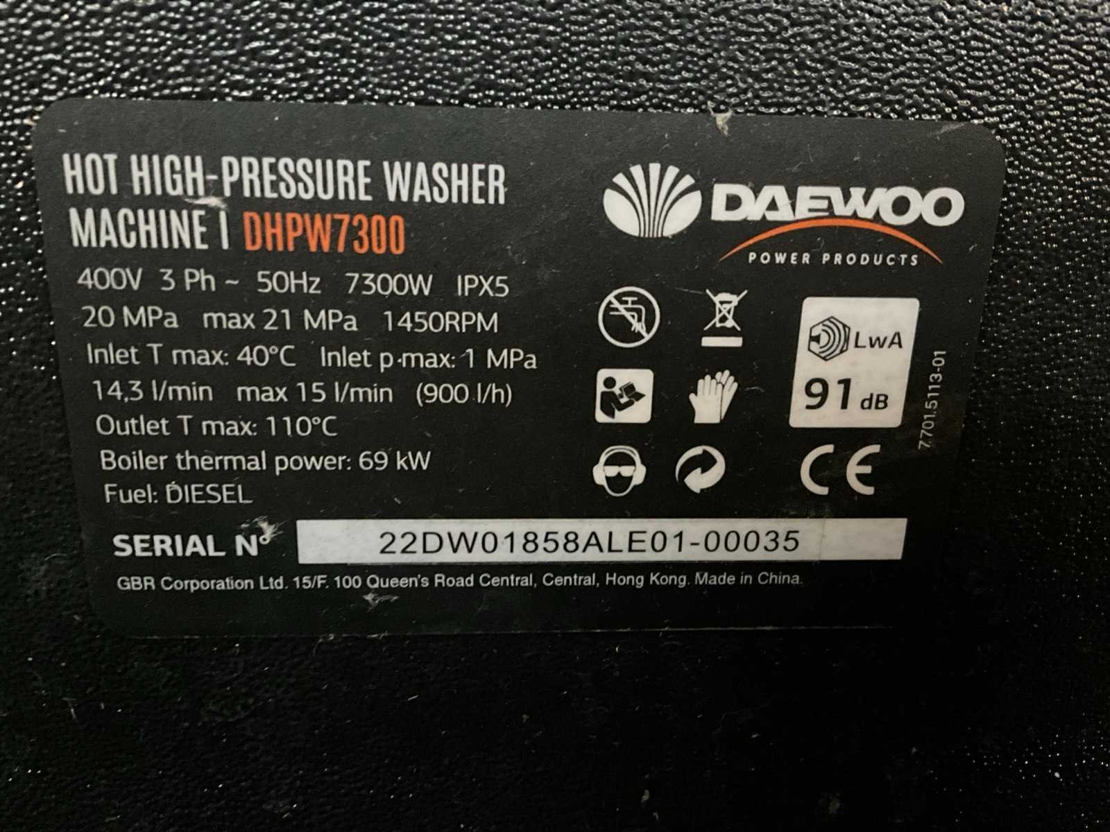 Heeft een storing in systeem, geen stekker verder alle onderdelen aanwezig. Merk: Daewoo Type: DHPW7300 Serienummer: 22DW01858ALE01-00035 Temperatuurbereik max.: 110°c Capaciteit.: 900l/hr Dieselgestookt: true Mobiel: true Vermogen: 69kW Aansluiting: 400V Totale afmeting L: 1200mm Totale afmeting Breedte: 700mm Totale afmeting Hoogte: 870mm