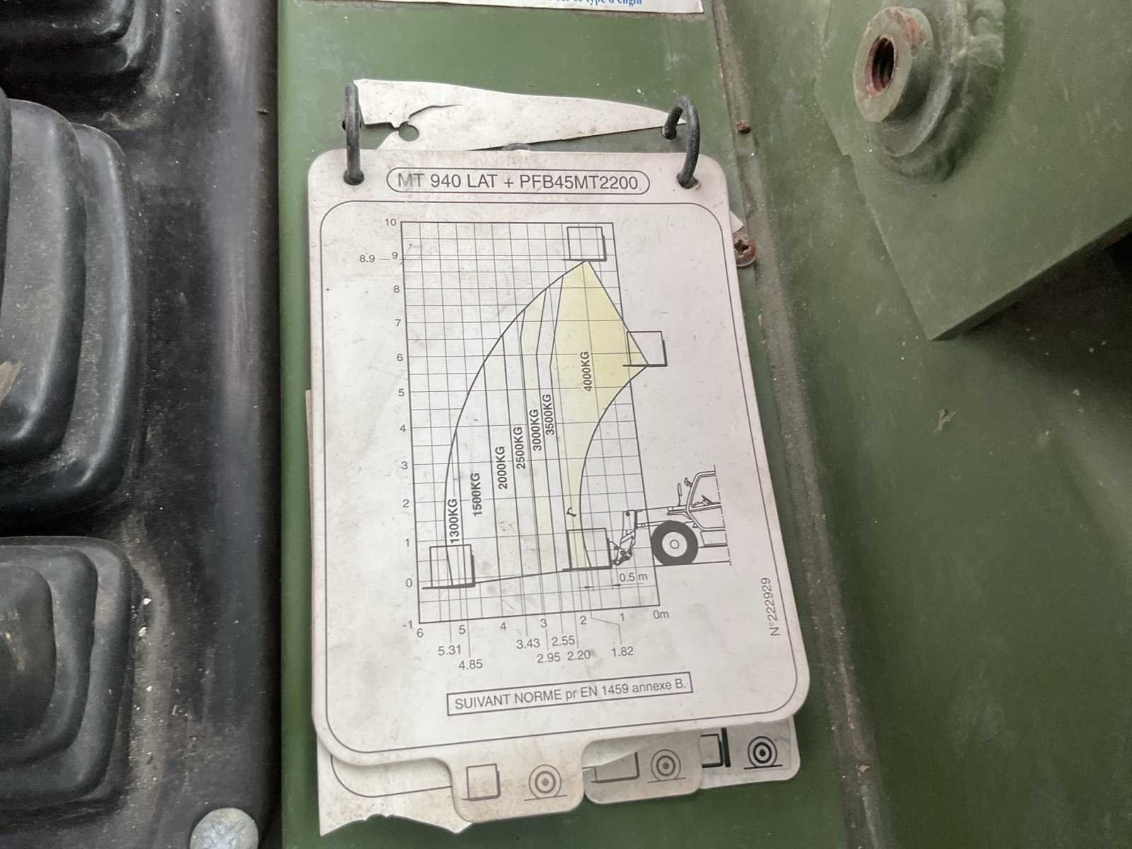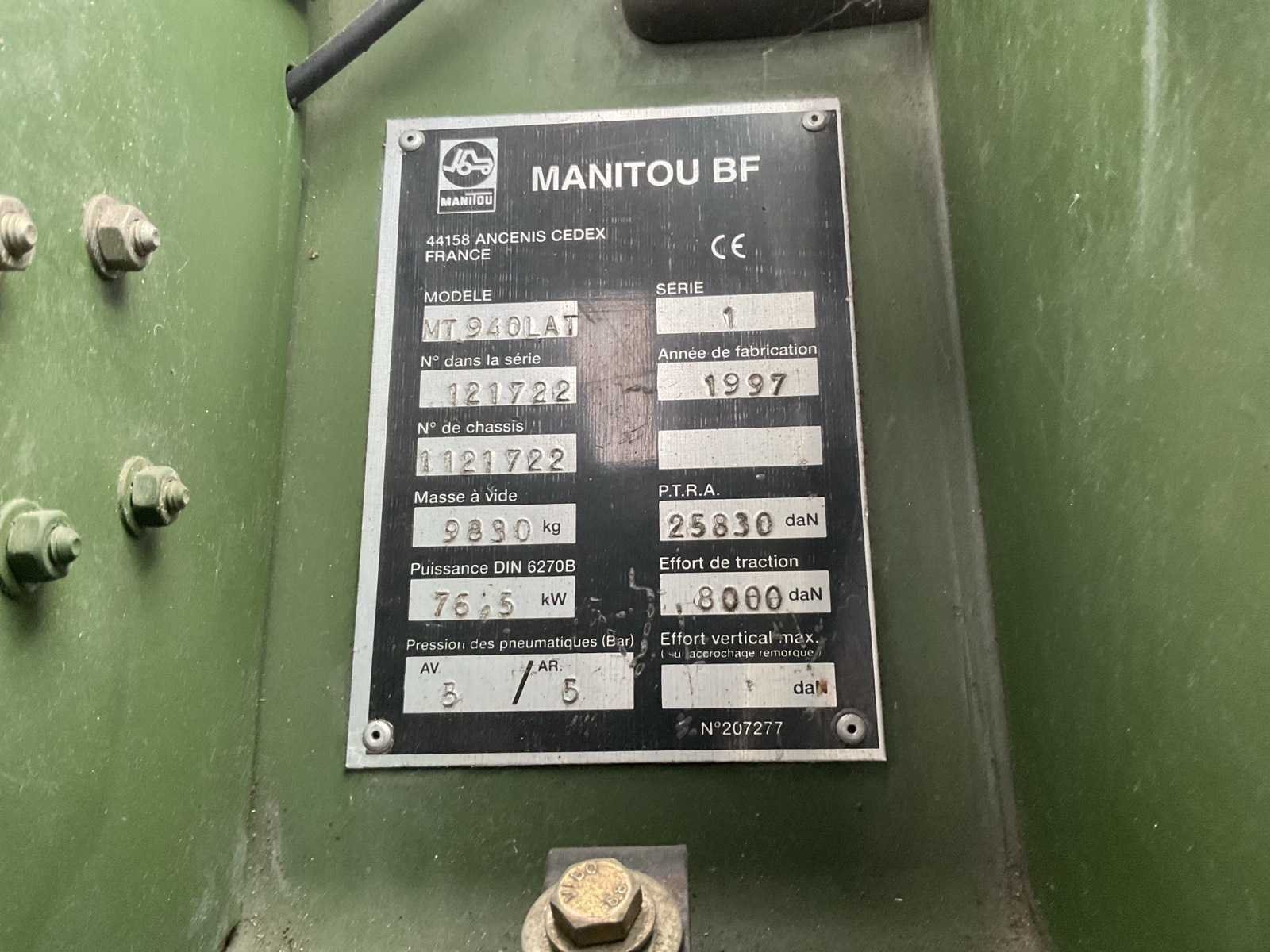 Perkins dieselmotor; 4 cilinder; 4 wielsturing; crabsturing; Merk: Manitou Type: MT 940 LAT Bouwjaar: 1997 Serienummer: 121722 Motorvermogen (kW): 76.5kW Hefvermogen: 4000kg Hefhoogte: 8900mm Cabine: true Vierwielaandrijving 4x4: true Lepellengte: 1000mm Luchtbanden: true Afgelezen urenstand: 1152 Eigen gewicht: 9830kg Totale afmeting L: 6500mm Totale afmeting Breedte: 2350mm Totale afmeting Hoogte: 2550mm