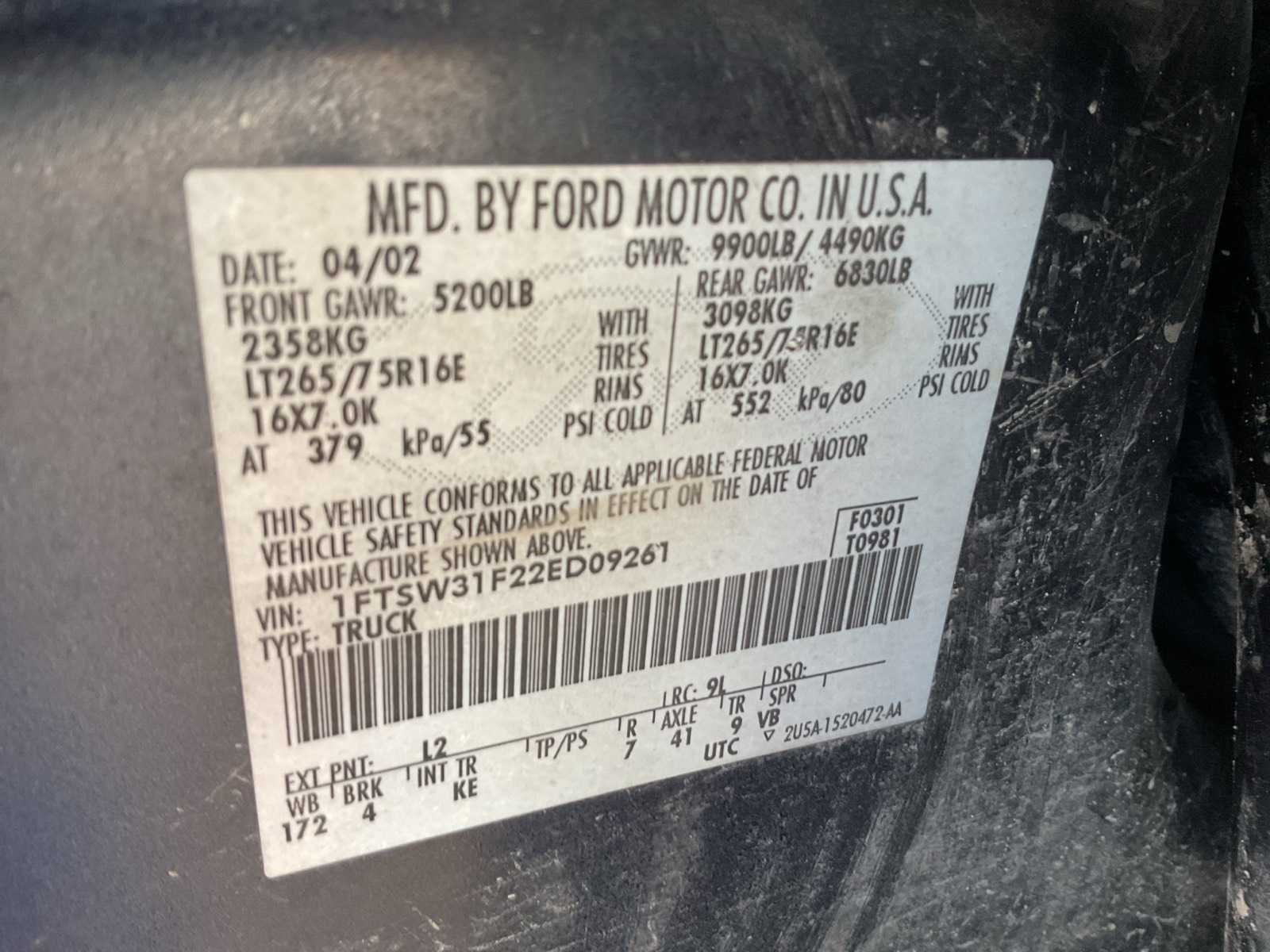 Aandrijfas licht beschadigd; Merk: Ford Type: F 350 Model: Pickup Bouwjaar: 2002 Chassisnummer: 1FTSW31F22ED09261 Afgelezen kilometerstand: 11067km Brandstof: diesel Aandrijving: 4x4 Transmissie: Automaat Aantal zitplaatsen: 6 Aantal deuren: 4 Aantal sleutels: 1 Aantal cilinders: 8 Startinformatie: Start met startbox No self drive export!: true