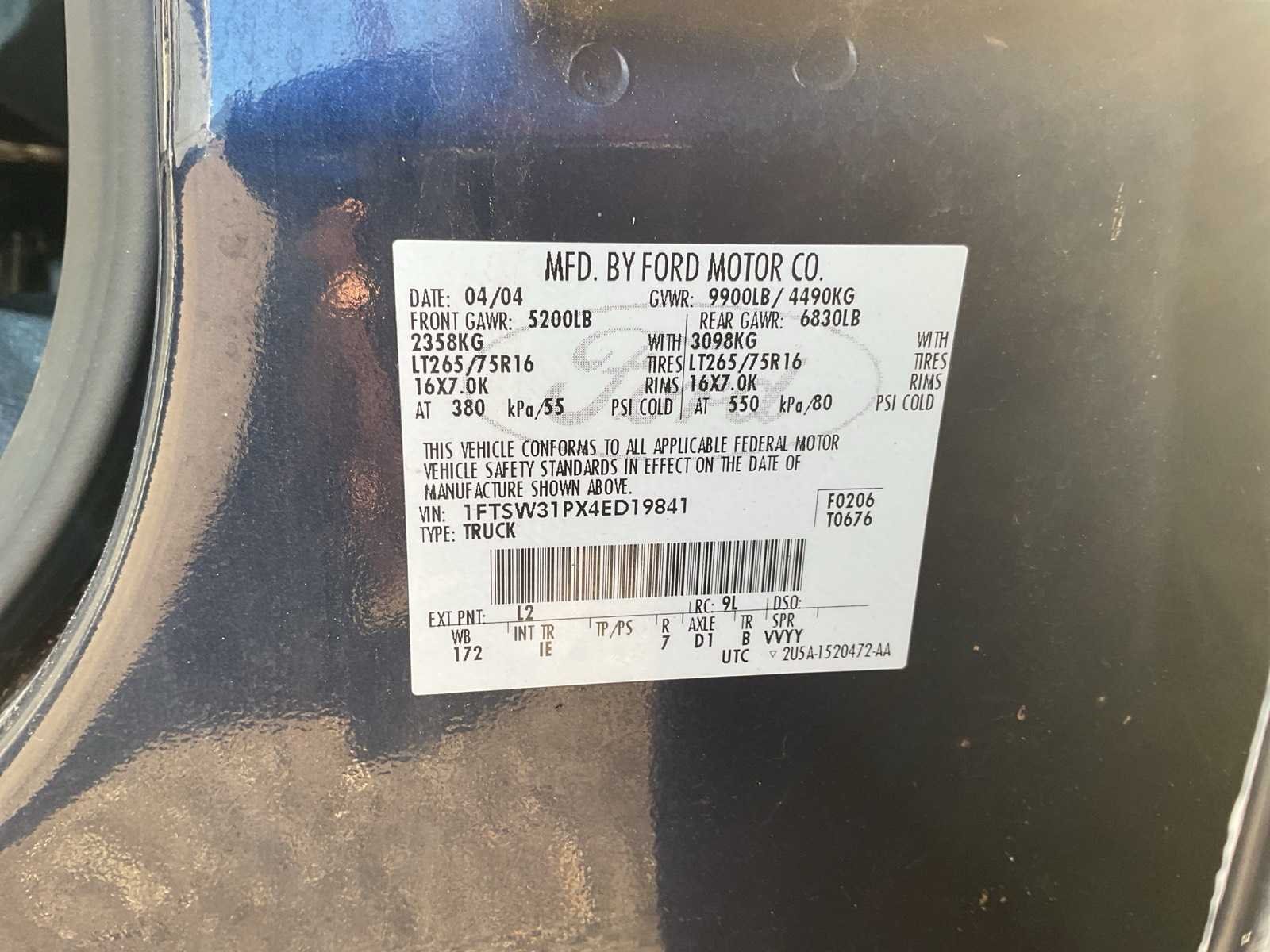 Aandrijfas licht beschadigd; voertuig gedrained; werking onbekend Merk: Ford Type: Pick up Model: F-350 XL Super Duty Bouwjaar: 2004 Chassisnummer: 1FTSW31PX4ED19841 Brandstof: diesel Afgelezen mijlenstand: 40590mi Aandrijving: 4x4 Transmissie: Automaat Aantal zitplaatsen: 6 Aantal deuren: 4 Aantal sleutels: 2 Aantal cilinders: 8 Onderhoudshistorie: Nee No self drive export!: true