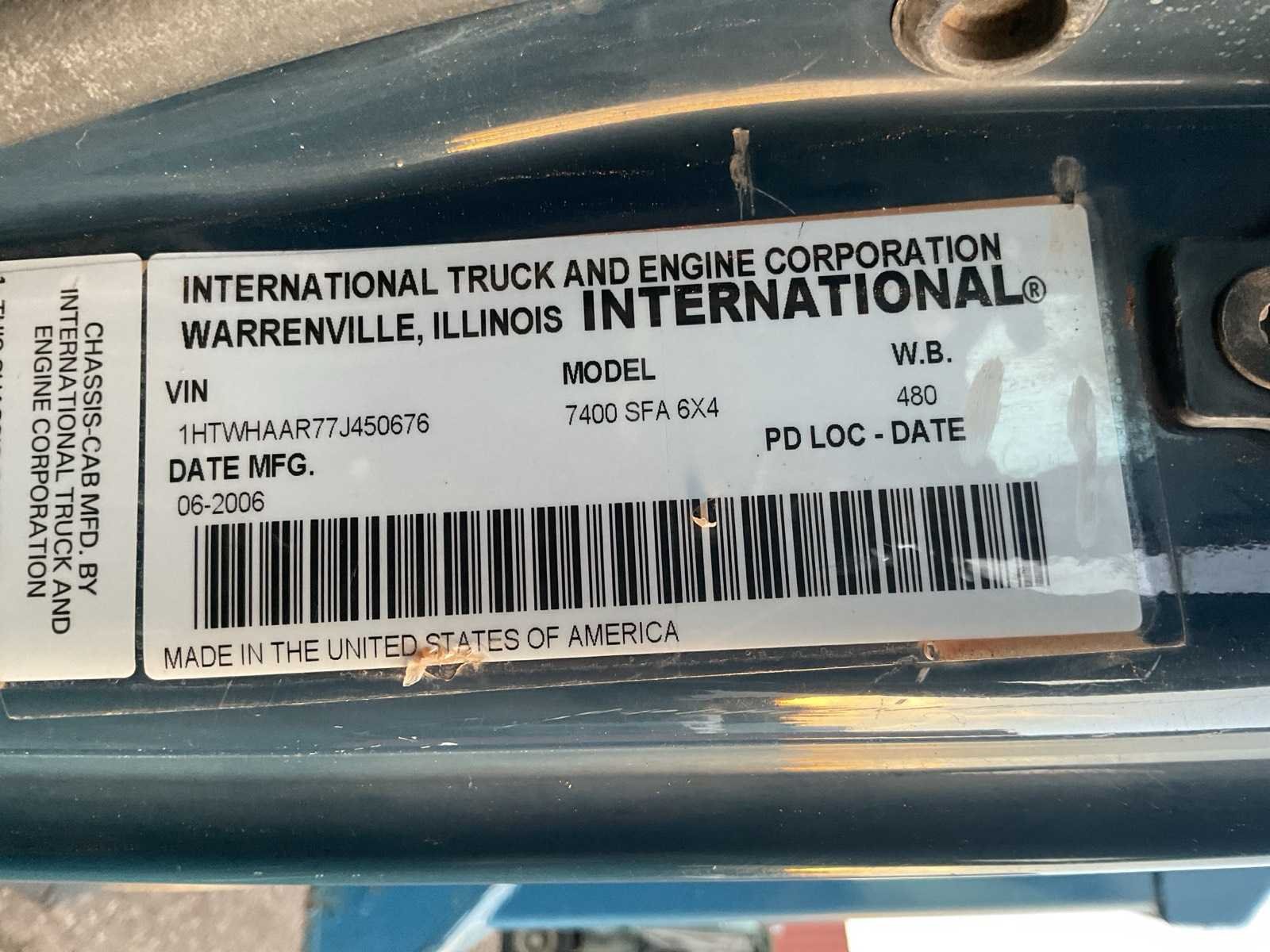 Aandrijfas licht beschadigd; vloeistoffen gedrained; werking onbekend Merk: International Type: 7400 Bouwjaar: 2006 Chassisnummer VIN: 1HTWHAAR77J450676 Type transmissie: Automaat Aantal assen: 3 Asconfiguratie: 6x4 Fuel Type: Diesel Aantal sleutels: 1 Startinformatie: Onbekend Aantal zitplaatsen: 2 Automaat: true Diesel: true No self drive export!: true