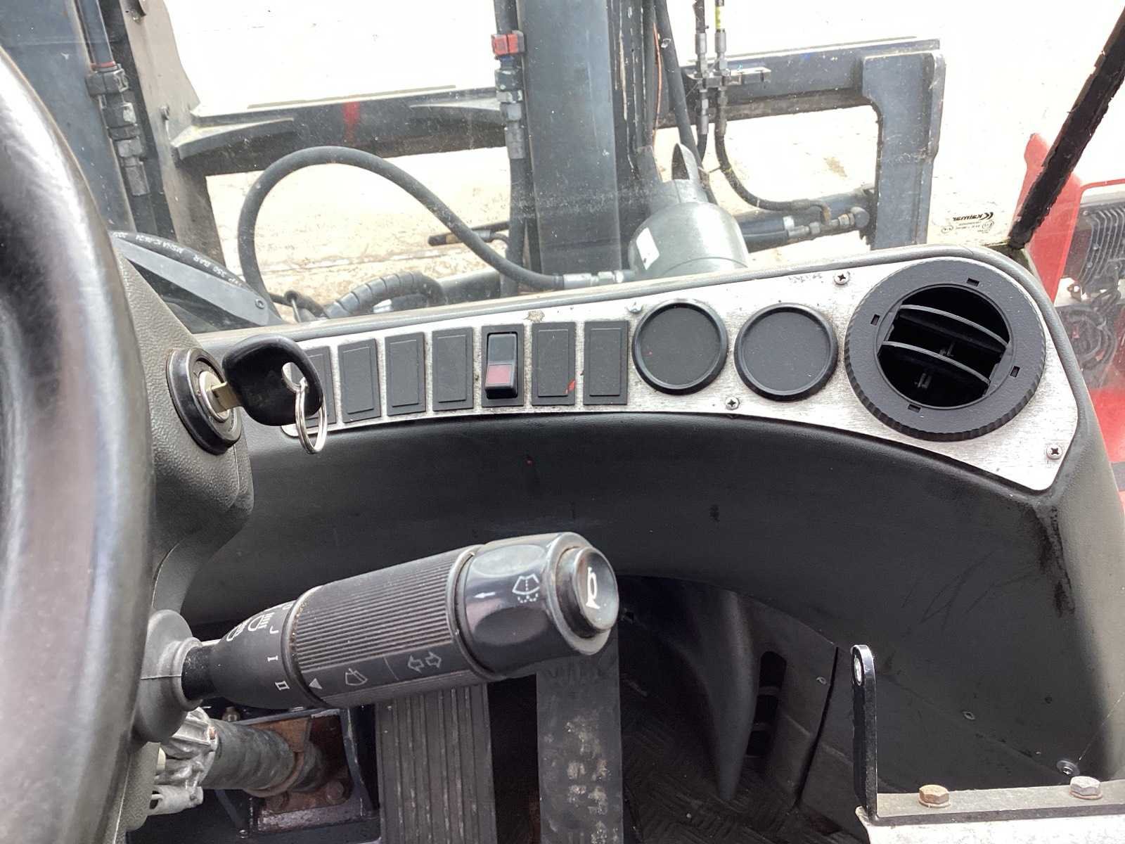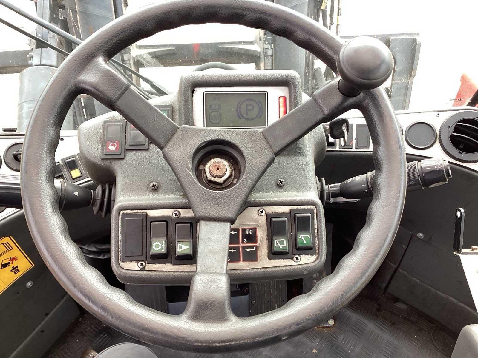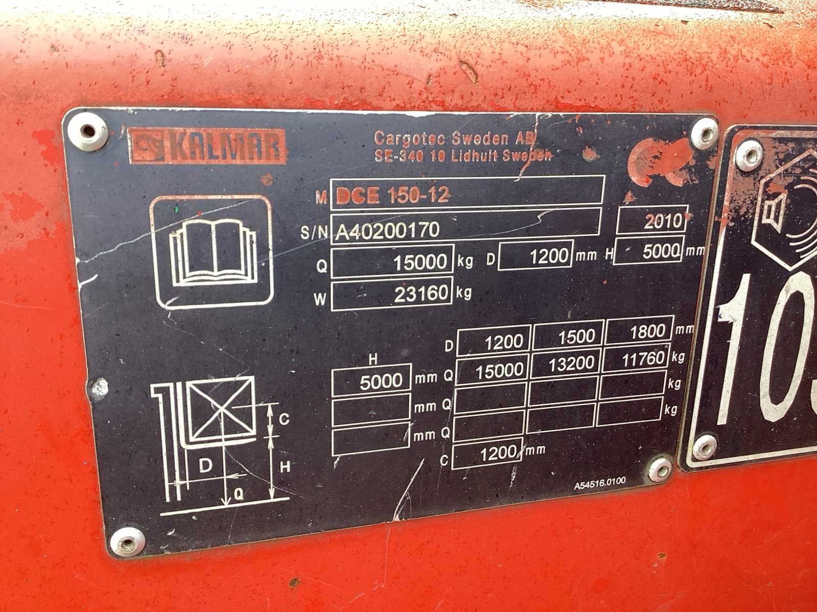 Volvo dieselmotor; 6 cilinder; Merk: Kalmar Type: DCE 150-12 Bouwjaar: 2010 Serienummer: A40200170 Brandstof: Diesel Mast: Duplex Soort band: Luchtbanden Aantal wielen: 4 Afgelezen urenstand: 18784 Hydraulisch verstelbare lepels: true Duplex mast: true Eigen gewicht: 23160kg Hefvermogen: 15000kg Lepellengte: 2400mm Max. hefhoogte: 5000mm Hefhoogte: 5000mm Luchtbanden: true Minimale doorrijhoogte: 4150mm