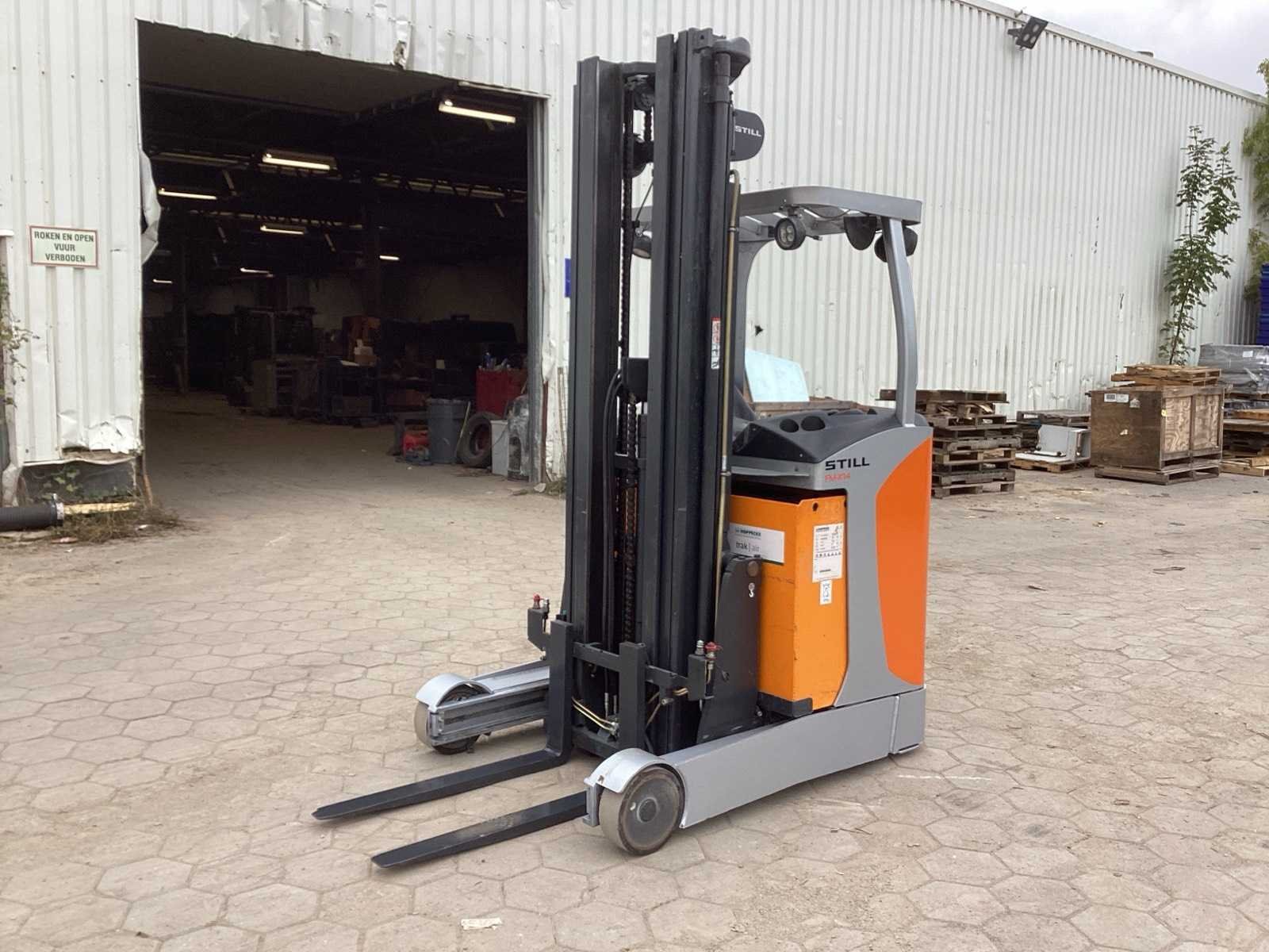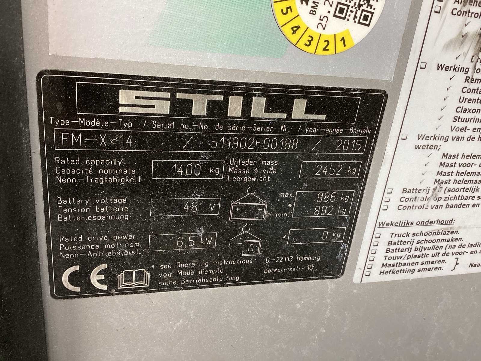 Geen lader Merk: Still Type: FM-X 14 Bouwjaar: 2015 Serienummer: 511902F00188 Brandstof: Elektrisch Mast: Triple Soort band: Massief Aantal wielen: 3 Afgelezen urenstand: 11862 Free-lift: true Triple mast: true Eigen gewicht: 3400kg Hefvermogen: 1400kg Lepellengte: 990mm Hefhoogte: 6520mm Minimale doorrijhoogte: 2700mm Elektrisch: true Vol rubber banden: true