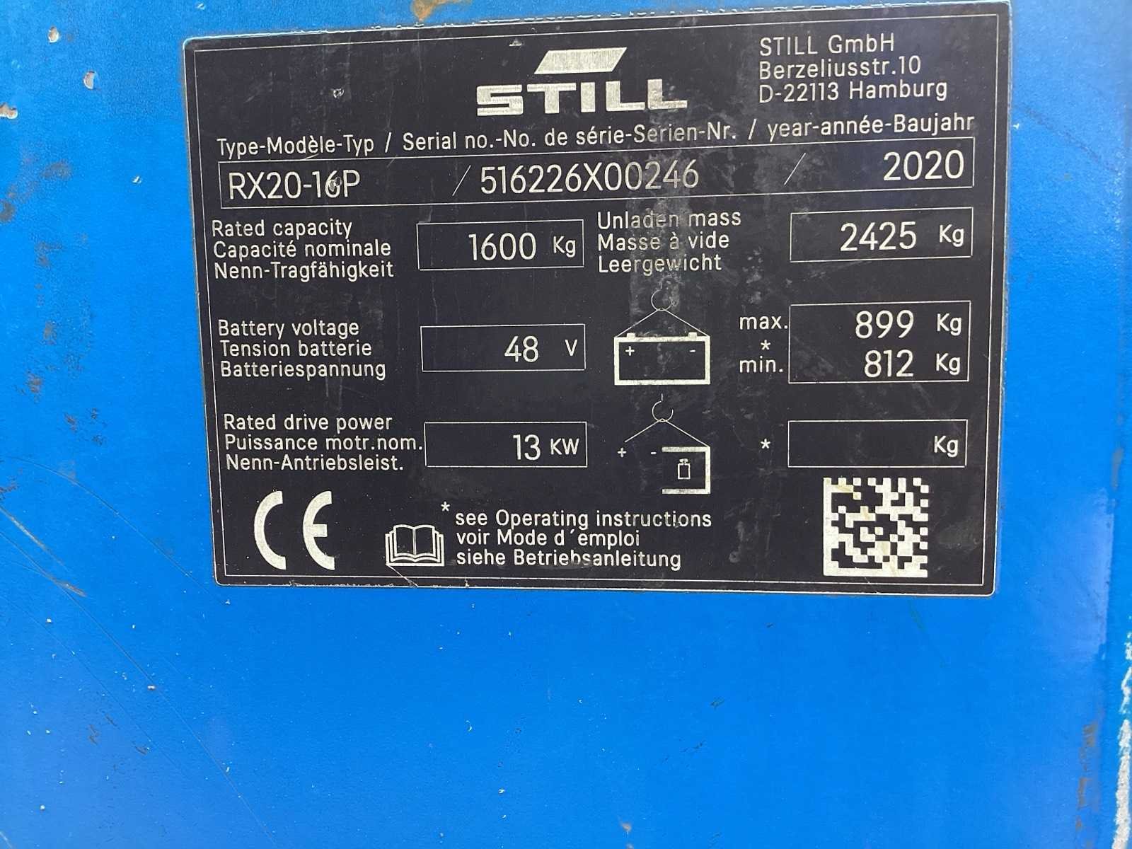 Geen lader; Merk: Still Type: RX20-16P Bouwjaar: 2020 Serienummer: 516226X00246 Brandstof: Elektrisch Mast: Triple Soort band: Volrubber banden Aantal wielen: 4 Free-lift: true Side-shift: true Triple mast: true Eigen gewicht: 2400kg Hefvermogen: 1600kg Lepellengte: 1090mm Max. hefhoogte: 5230mm Hefhoogte: 5230mm Vol rubber banden: true Minimale doorrijhoogte: 225mm