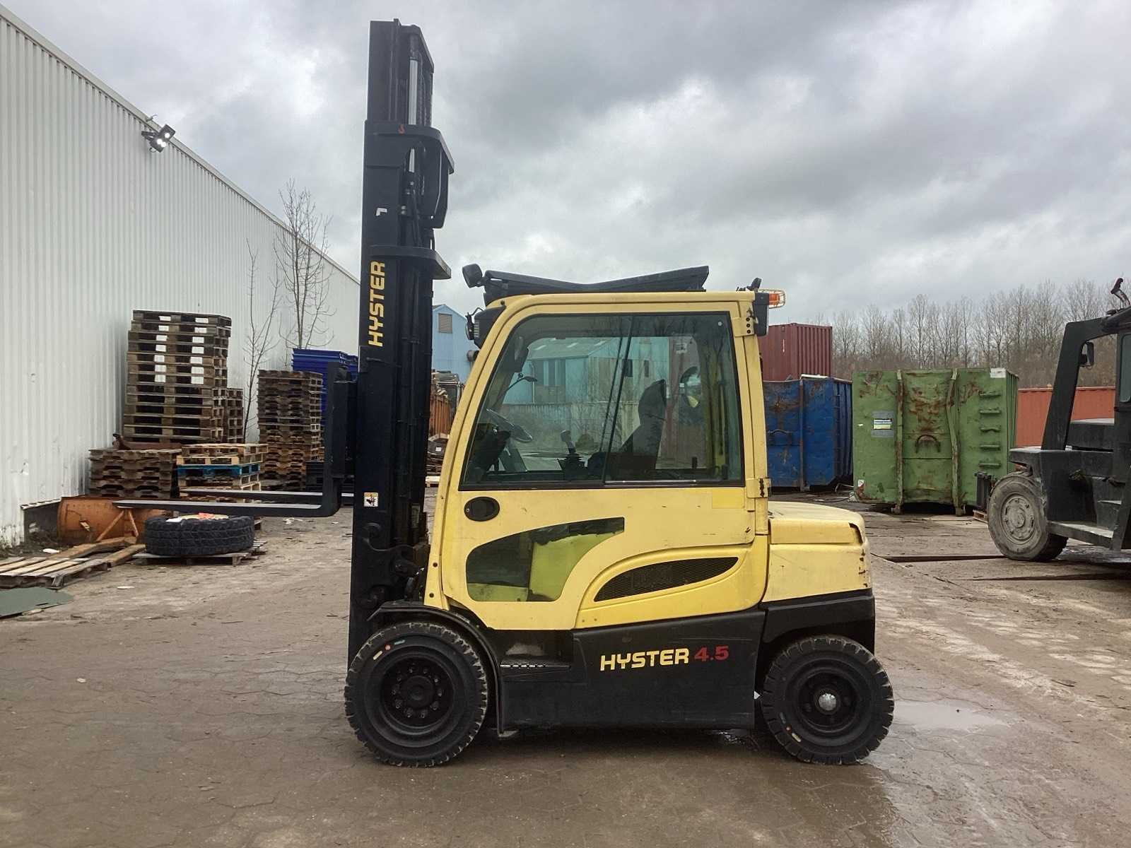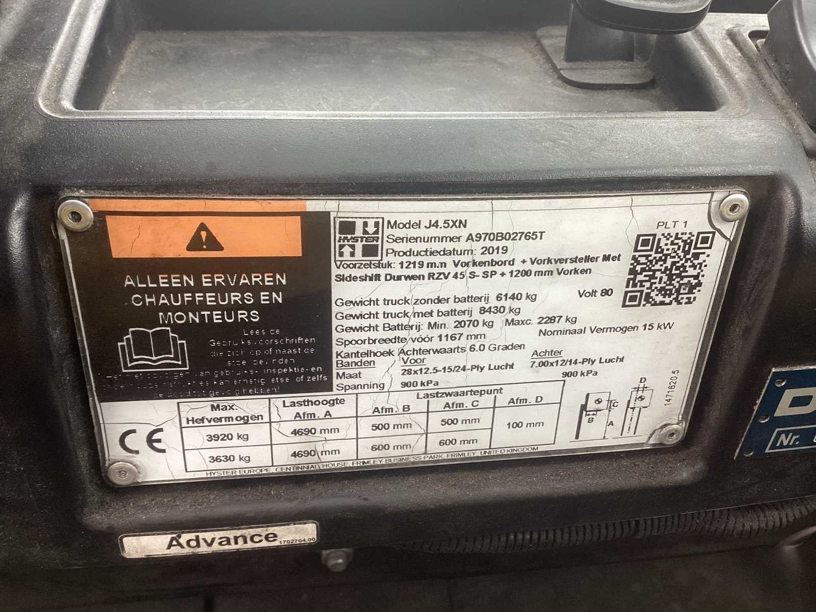 4 extra ventielen; geen lader; Merk: Hyster Type: J 4.5 XN Bouwjaar: 2019 Serienummer: A970B02765T Brandstof: Elektrisch Mast: Duplex Soort band: Volrubber banden Aantal wielen: 4 Duplex mast: true Eigen gewicht: 8430kg Hefvermogen: 3920kg Lepellengte: 1030mm Max. hefhoogte: 4690mm Hefhoogte: 4690mm Vol rubber banden: true Minimale doorrijhoogte: 3250mm