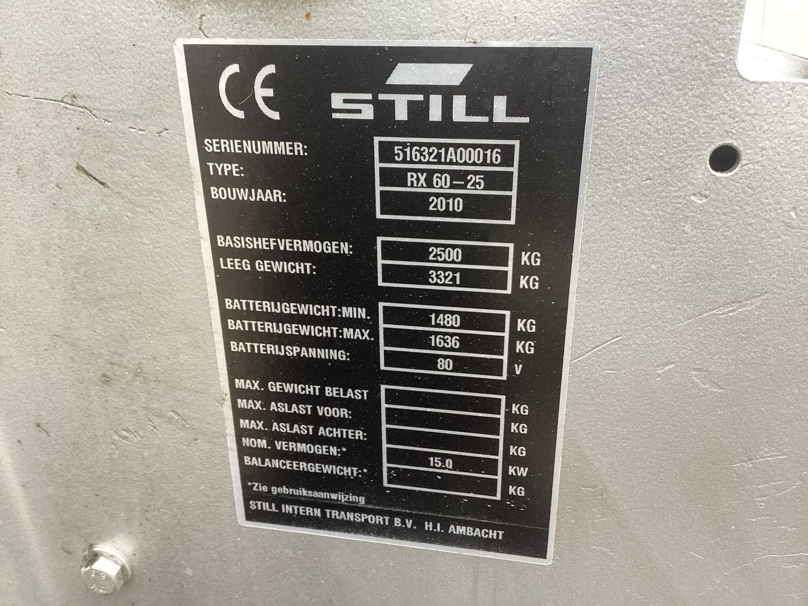 Geen lader; Merk: Still Type: RX 60-25 Bouwjaar: 2010 Serienummer: 516321A00016 Brandstof: Elektrisch Mast: Duplex Soort band: Volrubber banden Aantal wielen: 4 Afgelezen urenstand: 11019 Free-lift: true Side-shift: true Hydraulisch verstelbare lepels: true Duplex mast: true Eigen gewicht: 4800kg Hefvermogen: 2500kg Lepellengte: 1180mm Max. hefhoogte: 4200mm Hefhoogte: 4200mm Vol rubber banden: true Minimale doorrijhoogte: 2700mm