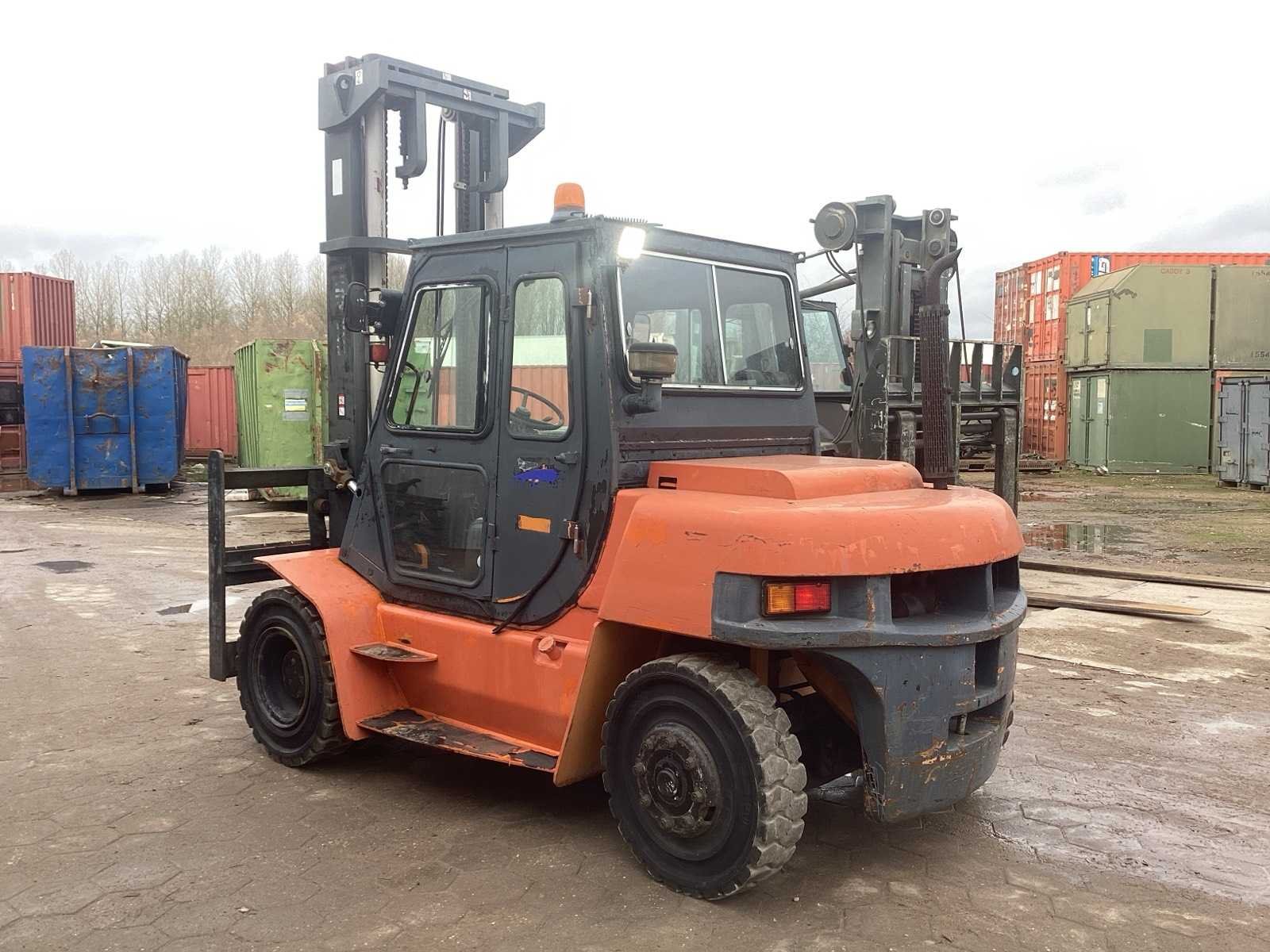 Perkins dieselmotor; 4 cilinder; 2 extra ventielen; Merk: Clarck Type: SF 60 D Bouwjaar: 1997 Serienummer: FA 50 DT Brandstof: Diesel Mast: Duplex Soort band: Volrubber banden Aantal wielen: 4 Afgelezen urenstand: 5801 Eigen gewicht: 9220kg Hefvermogen: 6000kg Lepellengte: 2380mm Max. hefhoogte: 4500mm Hefhoogte: 4500mm Vol rubber banden: true Minimale doorrijhoogte: 3300mm Diesel: true