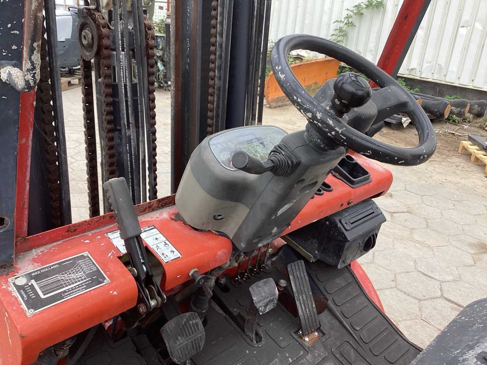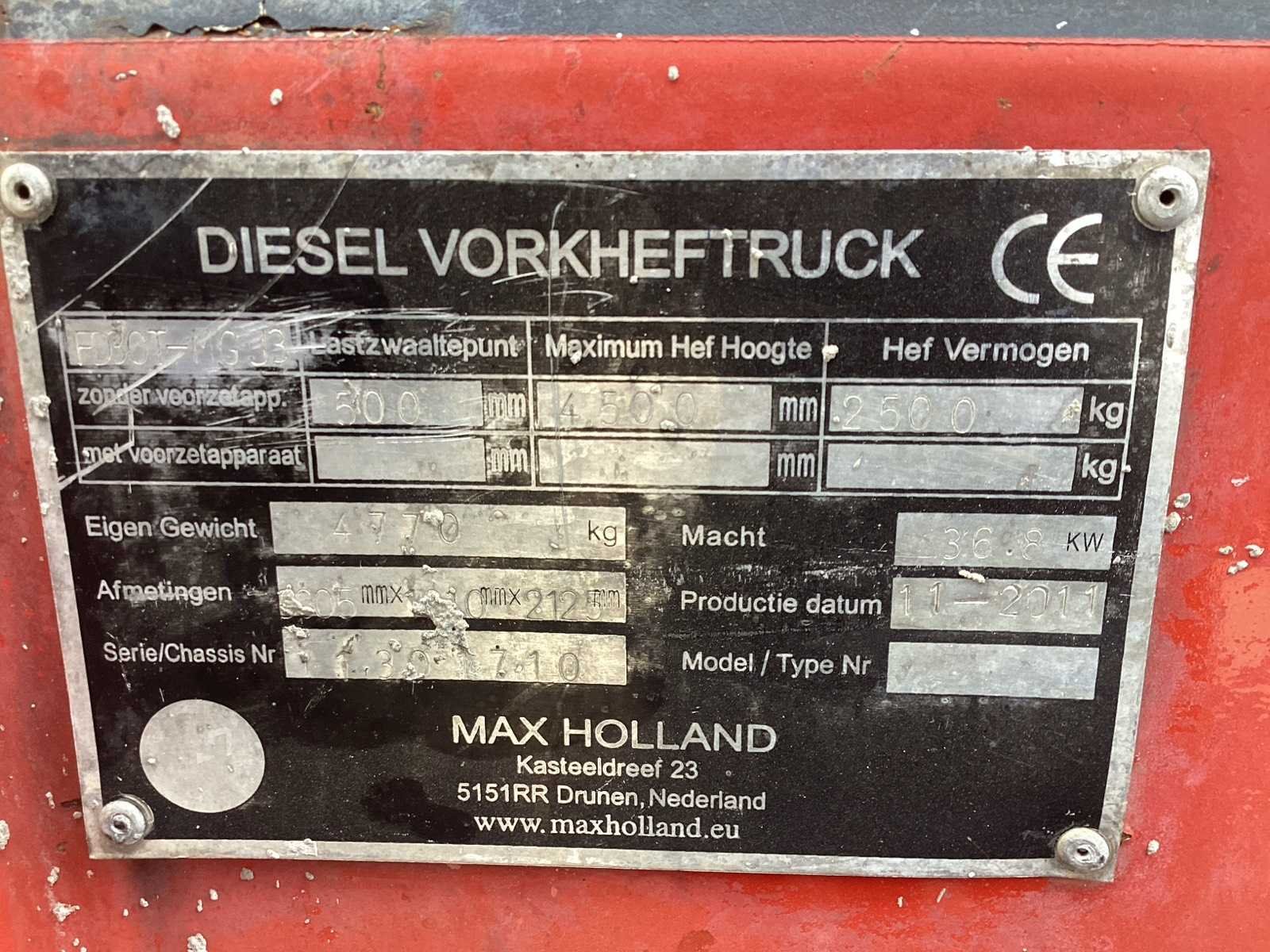 4 cilinder ; Merk: Max Holland Type: FD 30T Bouwjaar: 2011 Serienummer: 1301710 Brandstof: Diesel Mast: Triple Soort band: Volrubber banden Aantal wielen: 4 Free-lift: true Side-shift: true Triple mast: true Eigen gewicht: 4770kg Hefvermogen: 3000kg Lepellengte: 1380mm Max. hefhoogte: 4550mm Hefhoogte: 4550mm Vol rubber banden: true Minimale doorrijhoogte: 2450mm Diesel: true