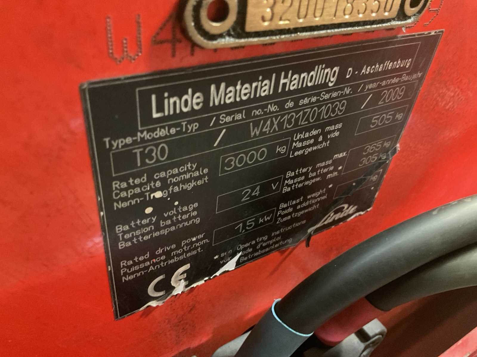 Geen lader; Merk: Linde Type: T30 Bouwjaar: 2009 Serienummer: W4X131Z01039 Hefvermogen: 3000kg Lepellengte: 1590mm Eigen gewicht: 505kg