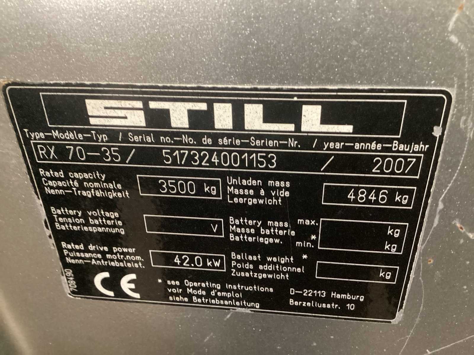 Geen sleutel; werking onbekend; 4 cilinder; Merk: Still Type: RX 70-35 Bouwjaar: 2007 Serienummer: 517324001153 Brandstof: Diesel Mast: Triple Soort band: Volrubber banden Aantal wielen: 4 Free-lift: true Triple mast: true Eigen gewicht: 4846kg Hefvermogen: 3500kg Vol rubber banden: true Minimale doorrijhoogte: 2300mm Diesel: true