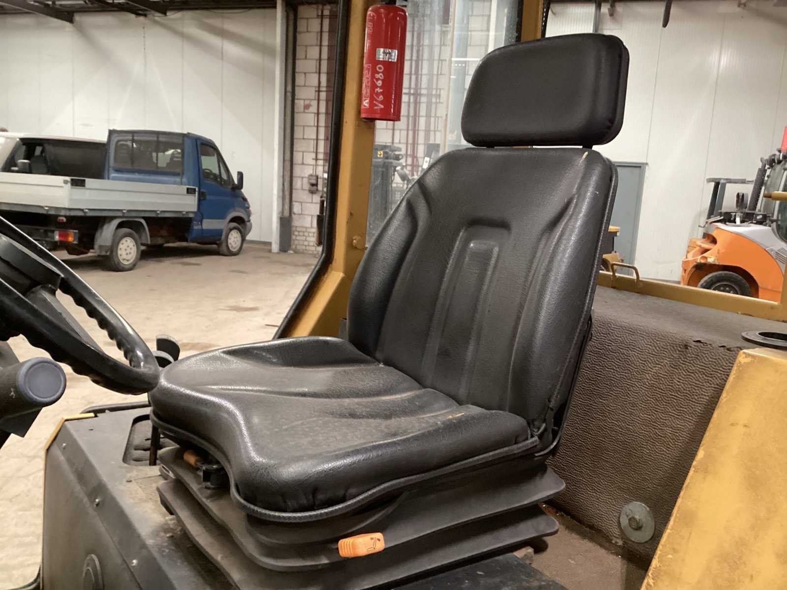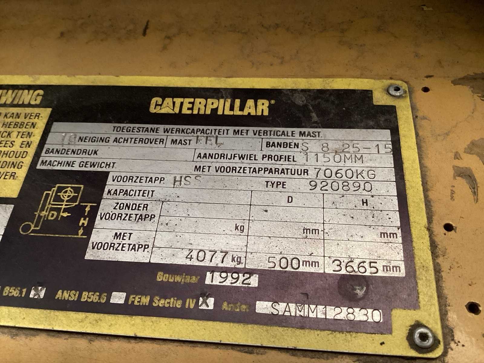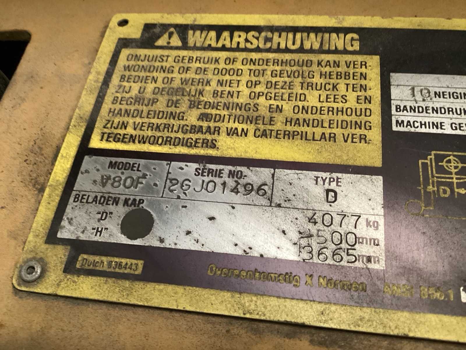 Perkins dieselmotor; 4 cilinder; geen sleutel; Merk: Caterpillar Type: V80 F Bouwjaar: 1992 Serienummer: 2GJ01496 Brandstof: Diesel Mast: Duplex Soort band: Volrubber banden Aantal wielen: 4 Afgelezen urenstand: 8495 Free-lift: true Side-shift: true Duplex mast: true Eigen gewicht: 7060kg Hefvermogen: 4000kg Max. hefhoogte: 3665mm Hefhoogte: 3665mm Vol rubber banden: true Minimale doorrijhoogte: 2500mm Diesel: true