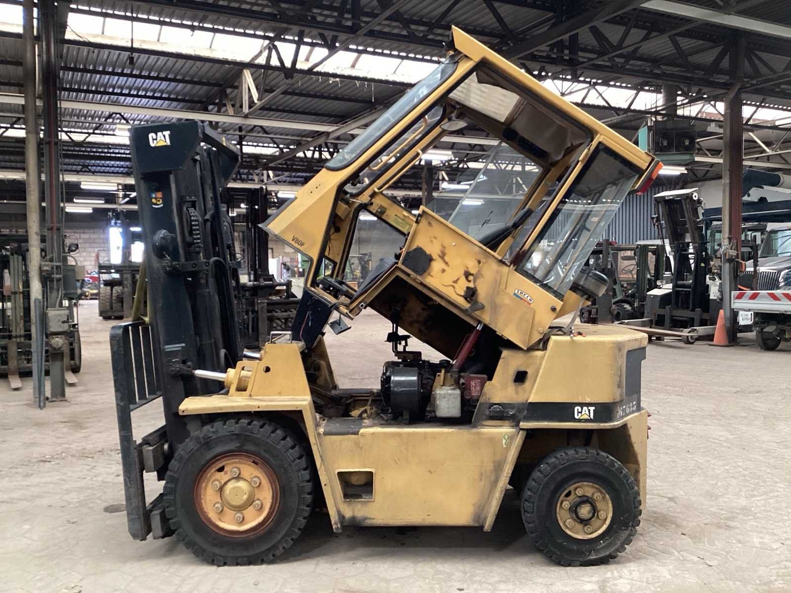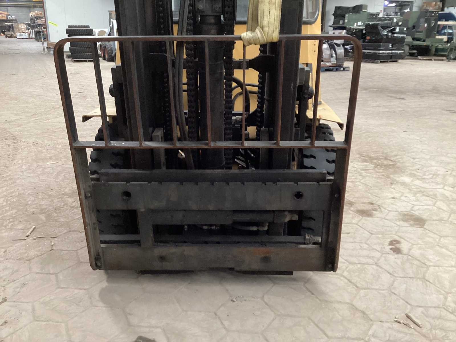 Perkins dieselmotor; 4 cilinder; geen sleutel; Merk: Caterpillar Type: V80 F Bouwjaar: 1992 Serienummer: 2GJ01489 Brandstof: Diesel Mast: Duplex Soort band: Volrubber banden Aantal wielen: 4 Afgelezen urenstand: 9404 Free-lift: true Side-shift: true Duplex mast: true Eigen gewicht: 7060kg Hefvermogen: 4000kg Max. hefhoogte: 3665mm Hefhoogte: 3665mm Vol rubber banden: true Minimale doorrijhoogte: 2500mm Diesel: true