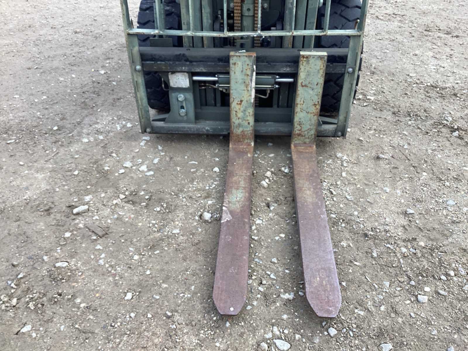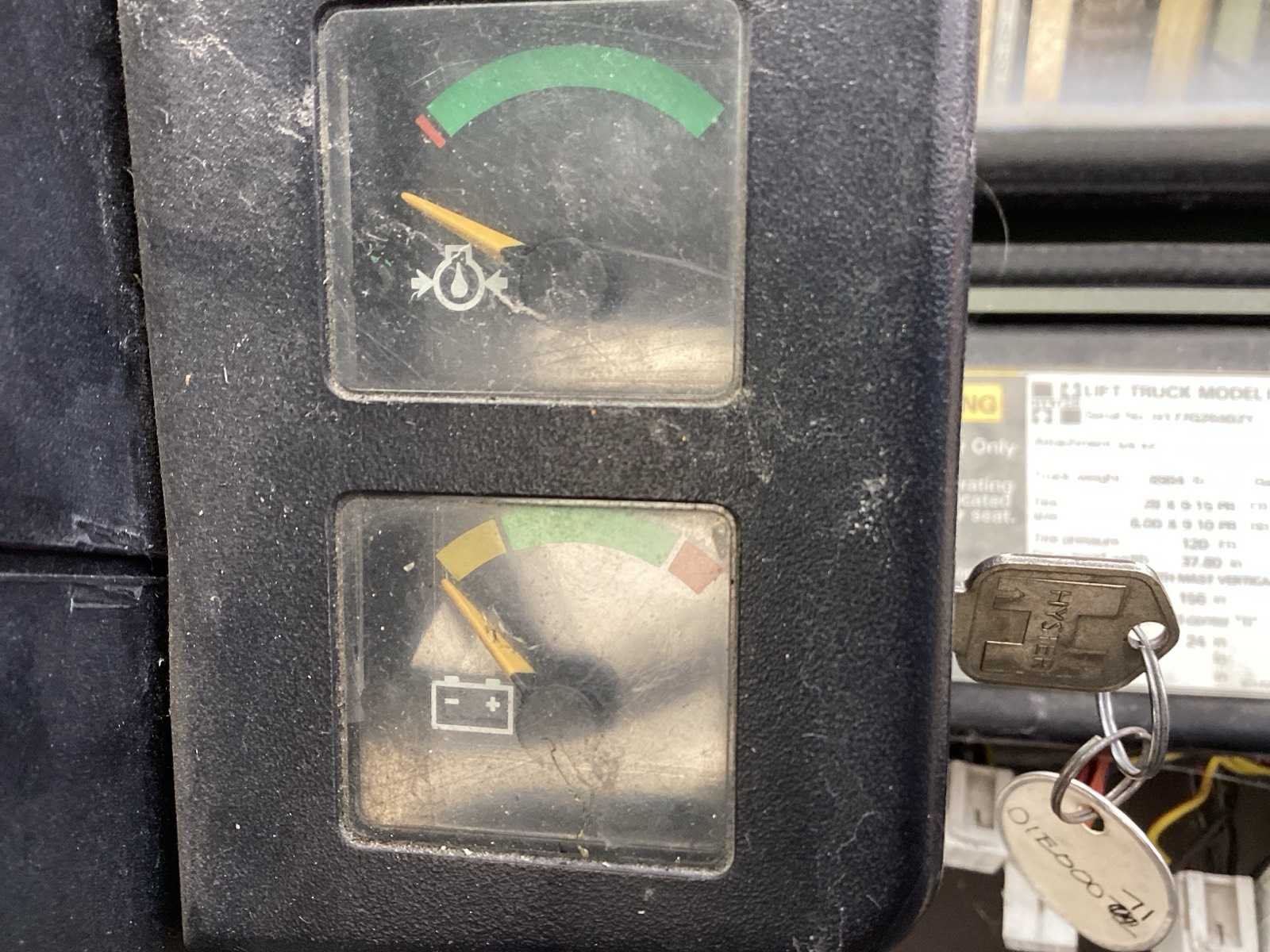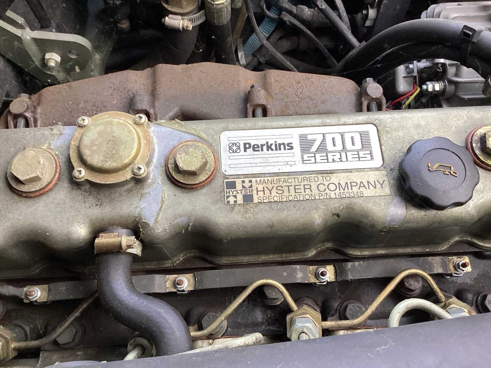 Perkins dieselmotor; 4 cilinder; geen sleutel; eigen gewicht 8984 lbs; capaciteit 4000 lbs; Merk: Hyster Type: H40XM Serienummer: H177G26402Y Brandstof: Diesel Mast: Triple Soort band: Luchtbanden Free-lift: true Side-shift: true Triple mast: true Lepellengte: 1060mm Luchtbanden: true Minimale doorrijhoogte: 2200mm Diesel: true