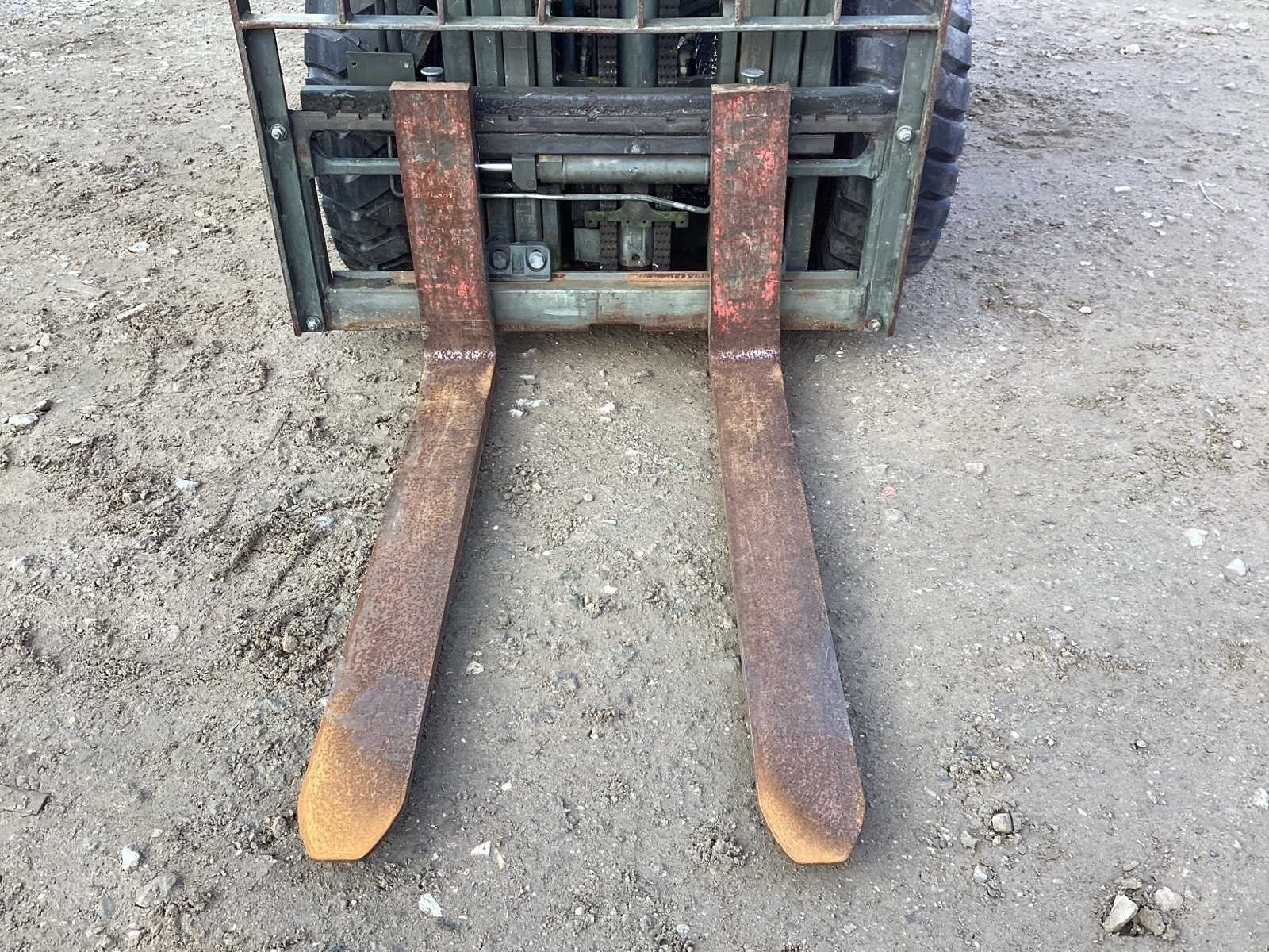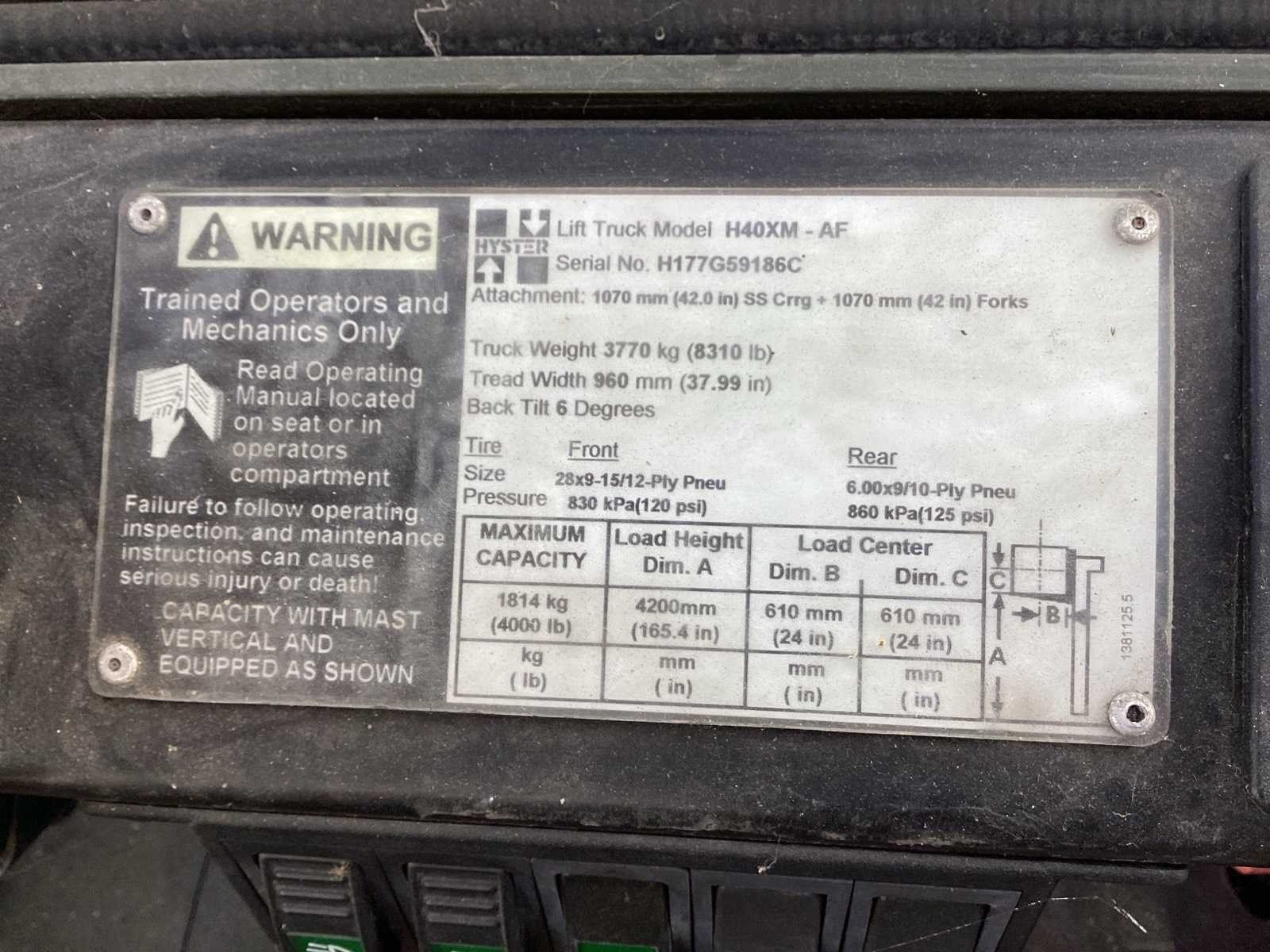 Perkins dieselmotor; 4 cilinder; geen sleutel; eigen gewicht 8984 lbs; capaciteit 4000 lbs; Merk: Hyster Type: H40XM Serienummer: H177G26402Y Brandstof: Diesel Mast: Triple Soort band: Luchtbanden Free-lift: true Side-shift: true Triple mast: true Lepellengte: 1060mm Luchtbanden: true Minimale doorrijhoogte: 2200mm Diesel: true