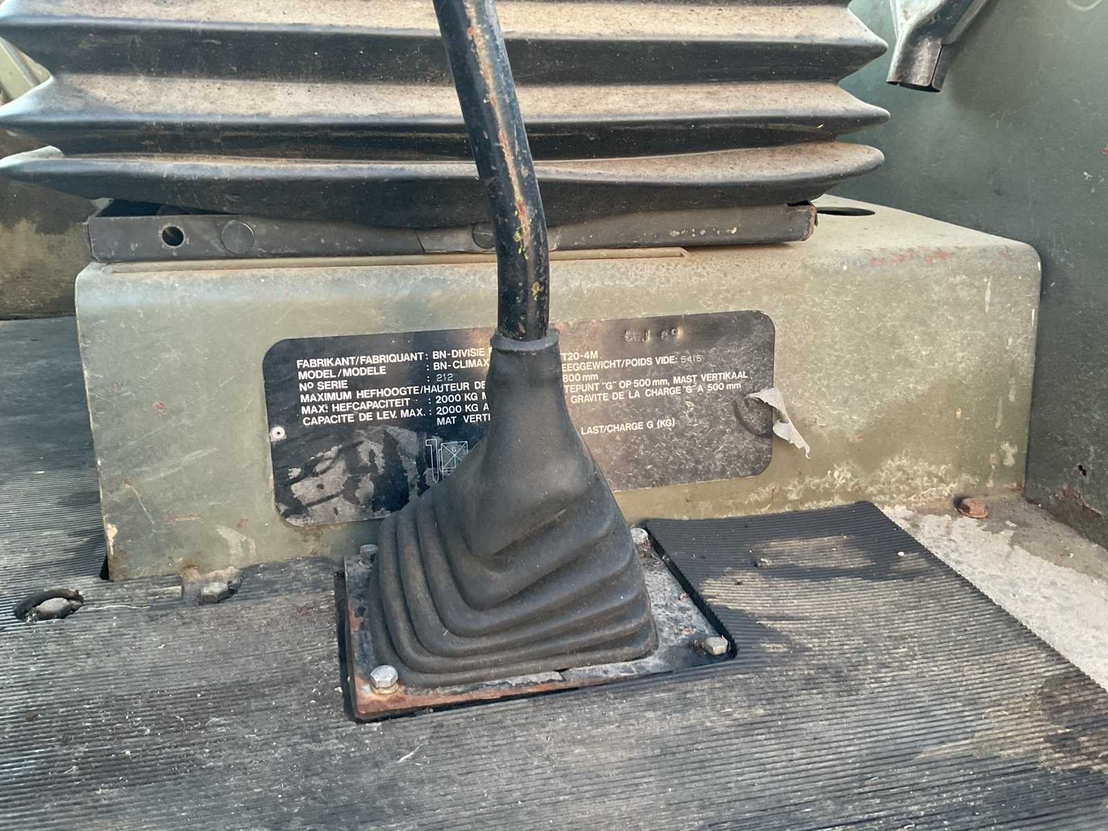 Geen sleutel; perkins dieselmotor; 4 cilinder; aandrijfas beschadigd; Merk: Brumeca Type: TT20-4M Serienummer: 212 Brandstof: Diesel Mast: Duplex Soort band: Luchtbanden Aantal wielen: 4 Afgelezen urenstand: 2576 Ruw terrein: true Side-shift: true Triple mast: true Eigen gewicht: 5415kg Hefvermogen: 2000kg Lepellengte: 1200mm Hefhoogte: 3400mm Luchtbanden: true Minimale doorrijhoogte: 2800mm Diesel: true