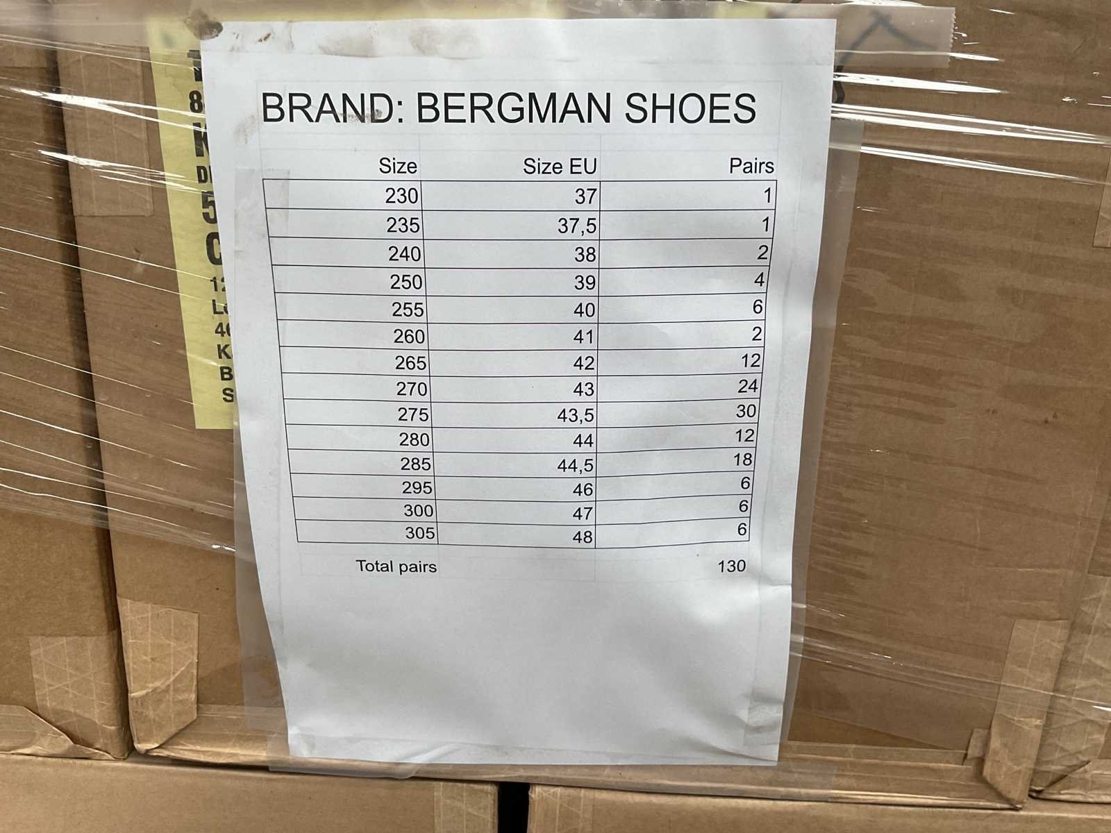 Total 130 pair of shoes; different sizes on pallet Merk: Bergmann