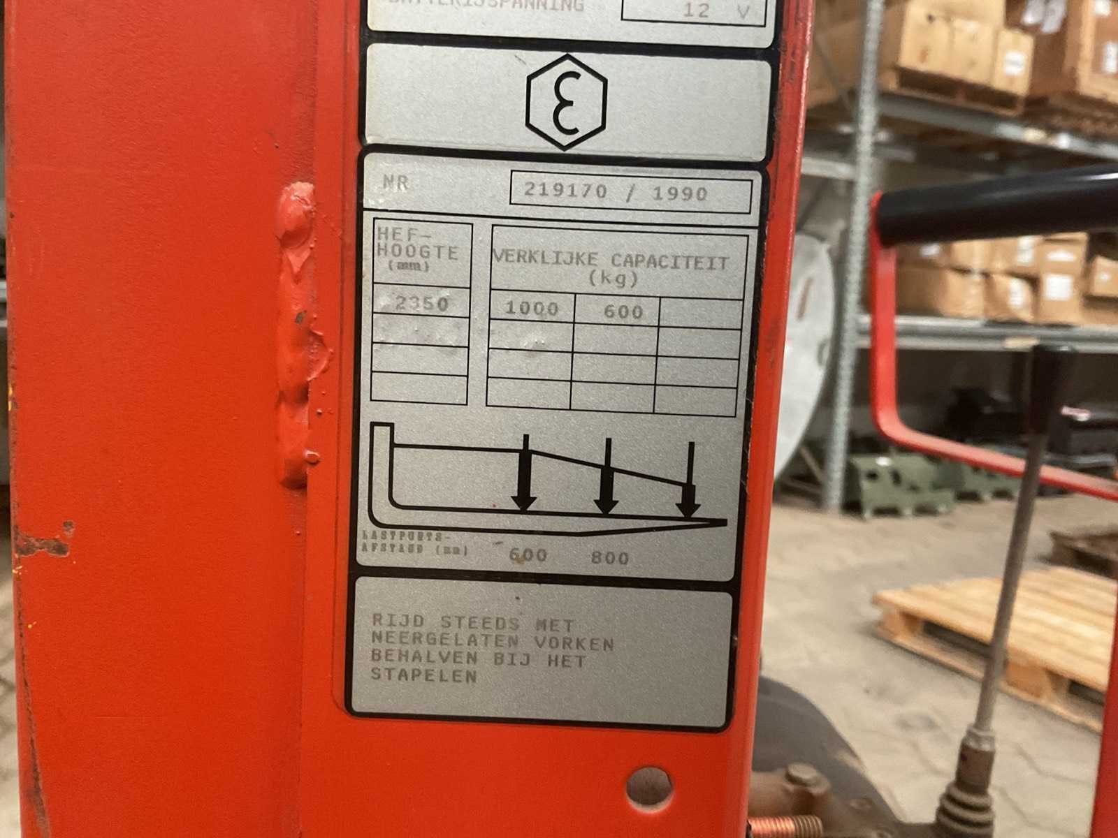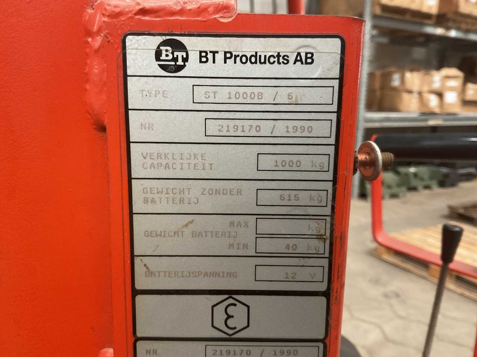 Merk: BT Type: ST1000B/6 Bouwjaar: 1990 Serienummer: 219170 Hefvermogen: 1000kg Hefhoogte: 2350mm Lepellengte: 1150mm