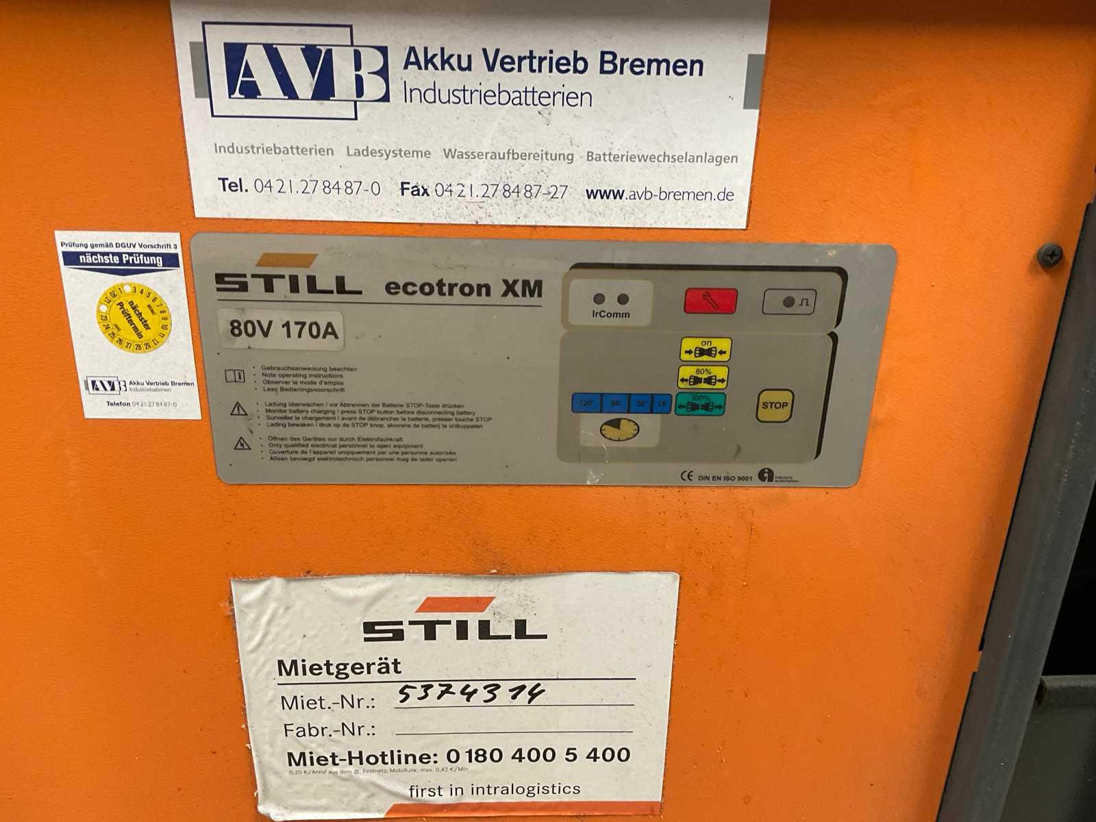 Merk: STILL Type: Ecotron XM Spanning: 80V Laadstroom: 170A Aansluiting: 400V Totale afmeting L: 750mm Totale afmeting Breedte: 540mm Totale afmeting Hoogte: 930mm