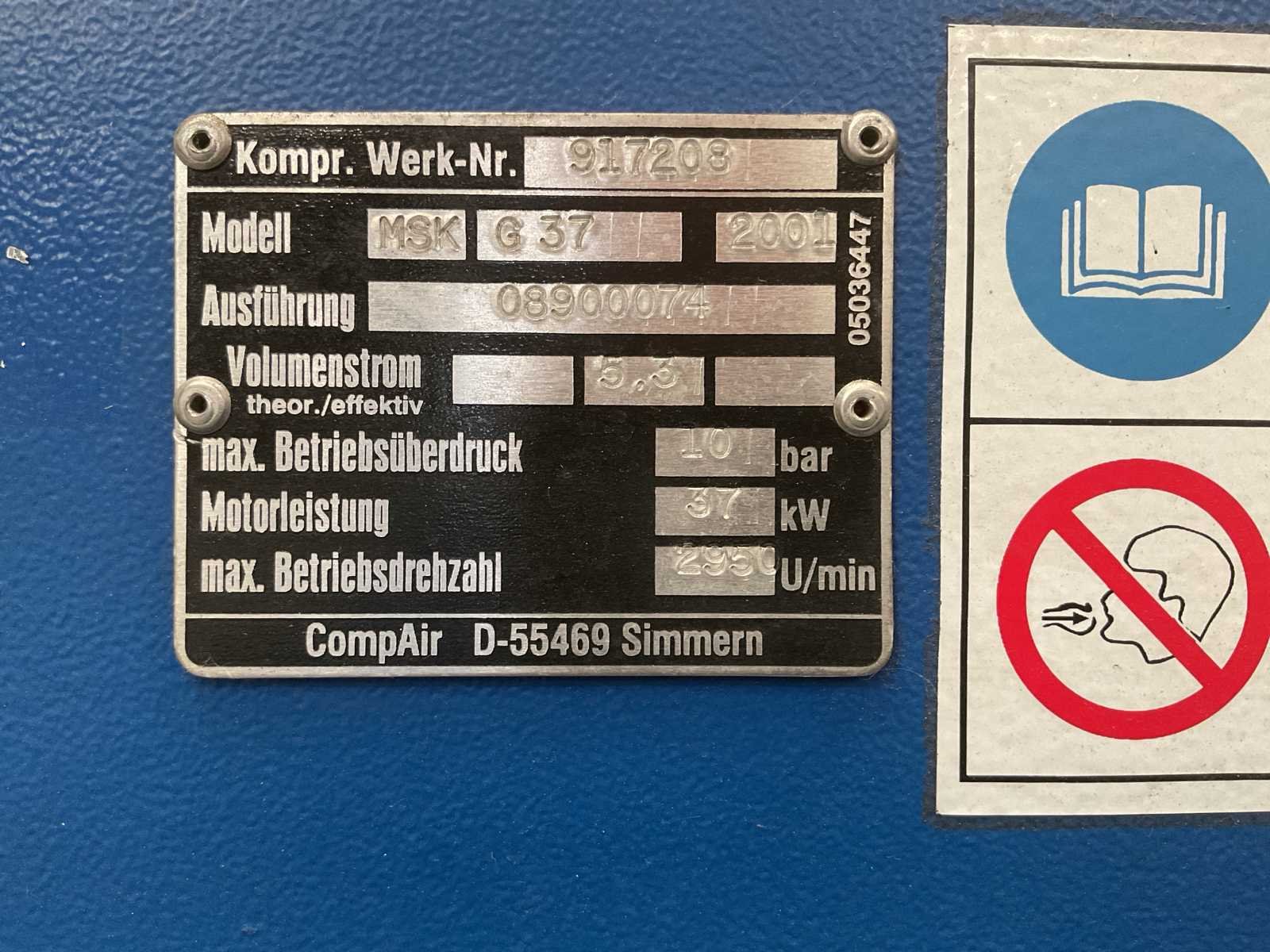 Merk: CompAir Type: MSK G37 Capaciteit.: 10bar Luchtstroom: 5.3l/min Vermogen: 37kW Totale afmeting L: 1180mm Totale afmeting Breedte: 910mm Totale afmeting Hoogte: 1890mm