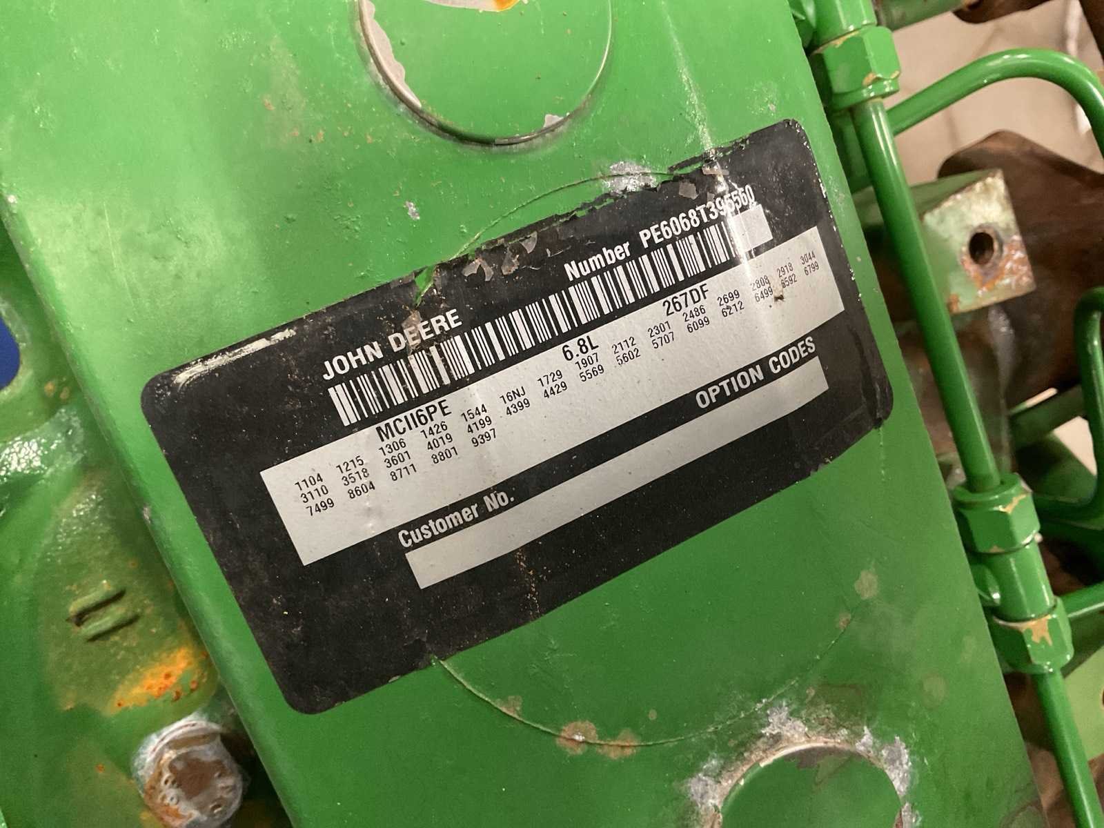 Merk: John Deere Type: PowerTech 6,8 liter Serienummer: PE6068T395560 Aantal cilinders: 6