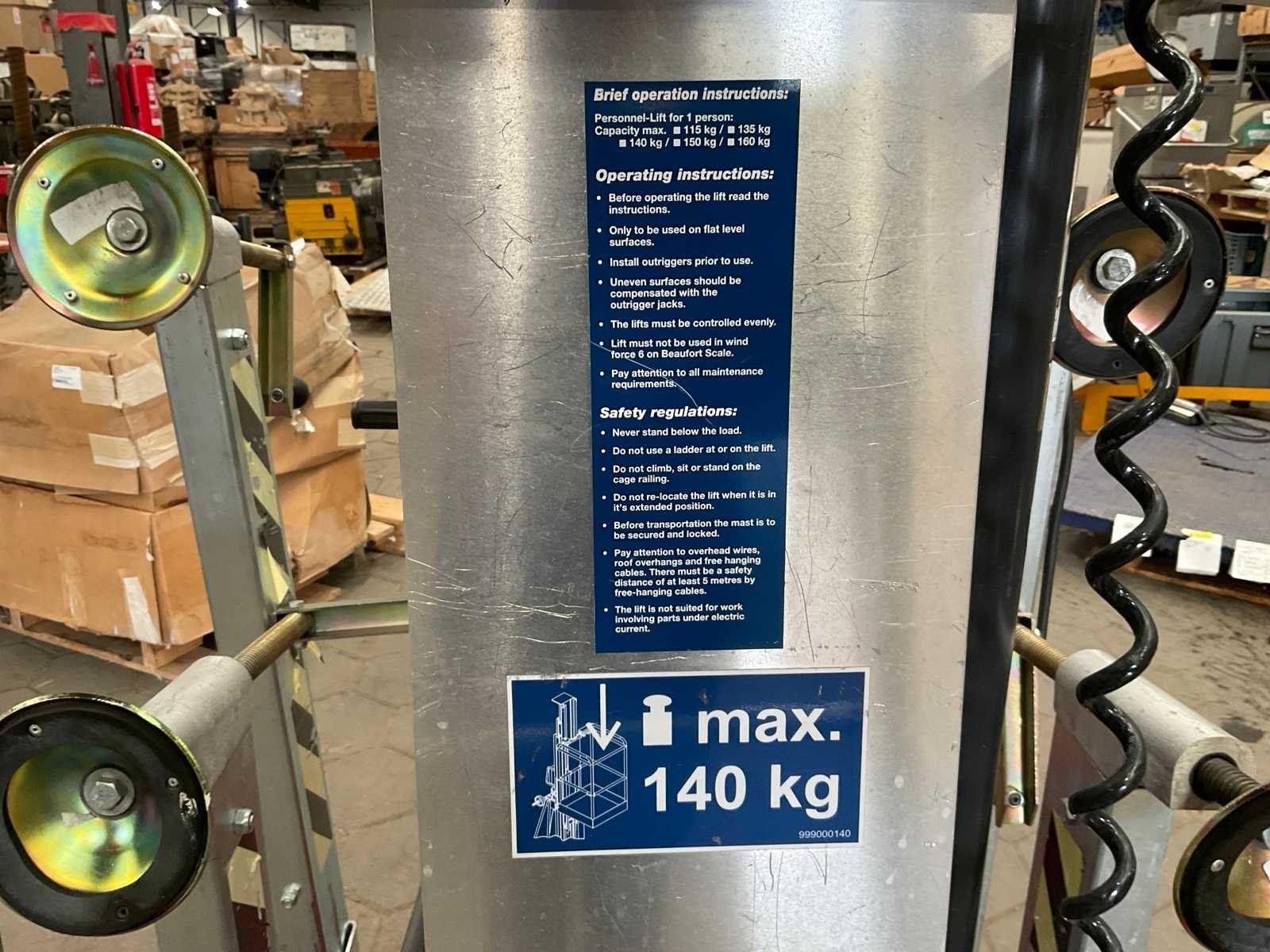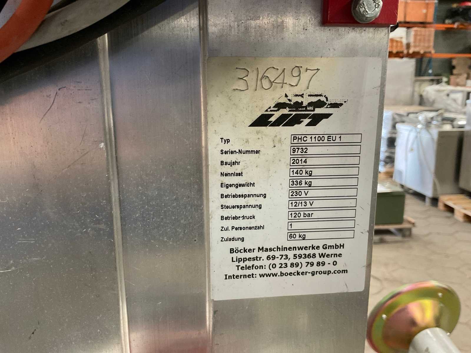 Merk: ALP Type: PHC 1100EU1 Bouwjaar: 2014 Serienummer: 9732 Max. belasting: 140kg Plateau afm. l: 650mm Plateau afm. b: 630mm Elektrisch aangedreven: true Aansluiting: 230V Eigen gewicht: 336kg Totale afmeting L: 1400mm Totale afmeting Breedte: 750mm Totale afmeting Hoogte: 1980mm