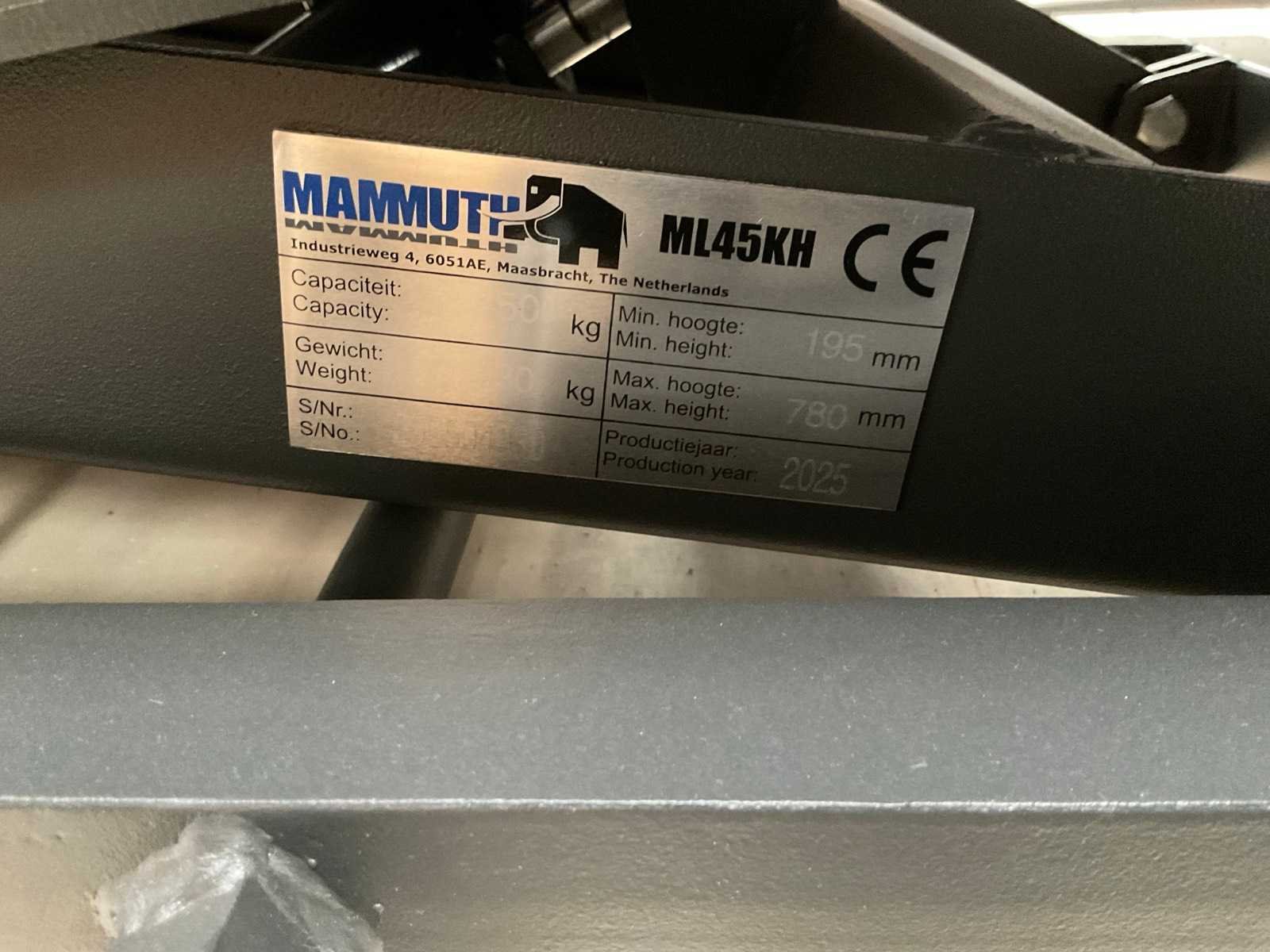 Merk: Mammuth Type: ML45KH Bouwjaar: 2025 Plateau afm. l: 1825mm Plateau afm. b: 660mm Capaciteit.: 450kg Hefhoogte: 780mm Eigen gewicht: 129.9kg