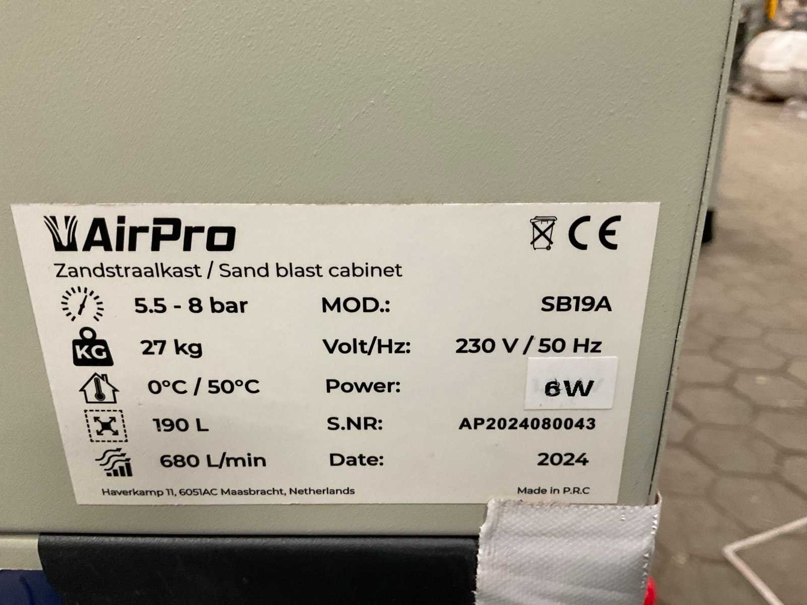 Merk: AirPro Type: SB19A Bouwjaar: 2024 Zand: true Aansluiting: 230V Machinegewicht: 27kg Afmeting l: 770mm Afmeting b: 510mm Afmeting h: 700mm