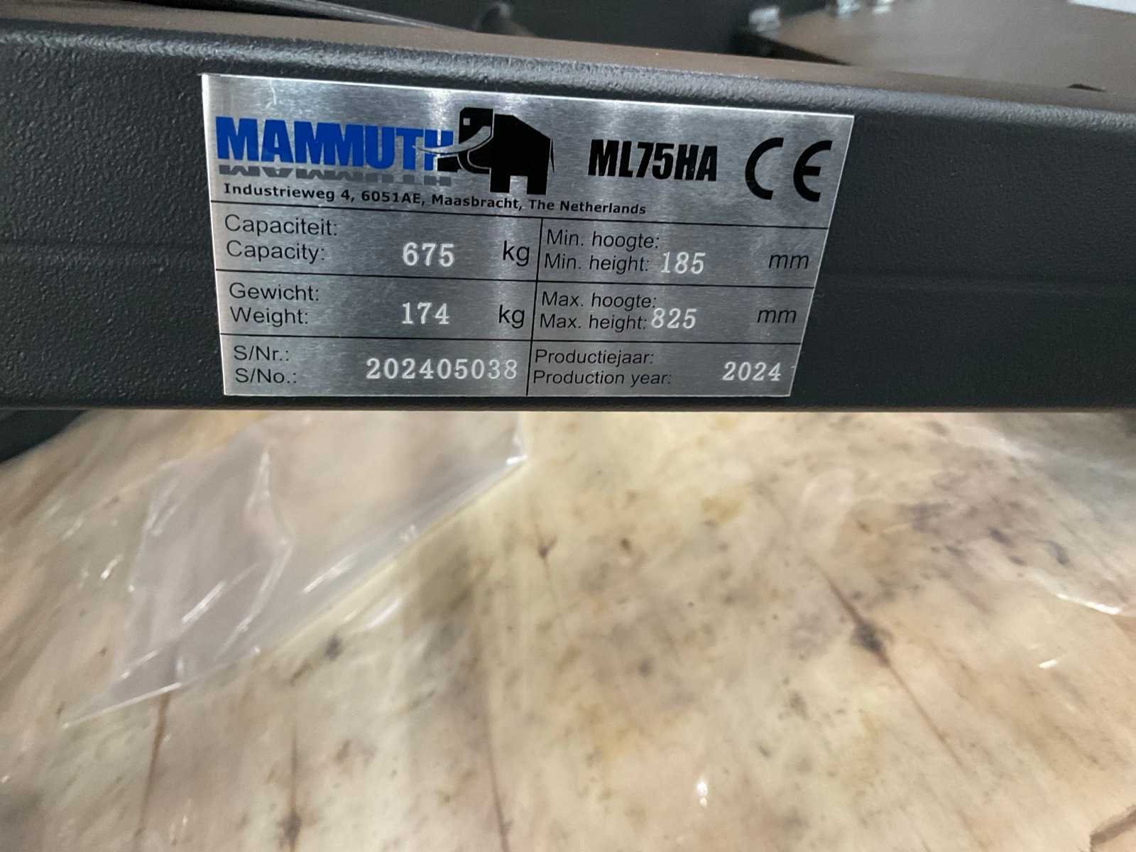 Merk: Mammuth Hefhoogte: 82.5cm Type: ML75HA Bouwjaar: 224 Capaciteit.: 675kg Baanbreedte: 1190mm Eigen gewicht: 174kg Totale afmeting L: 1995mm Totale afmeting Breedte: 1190mm