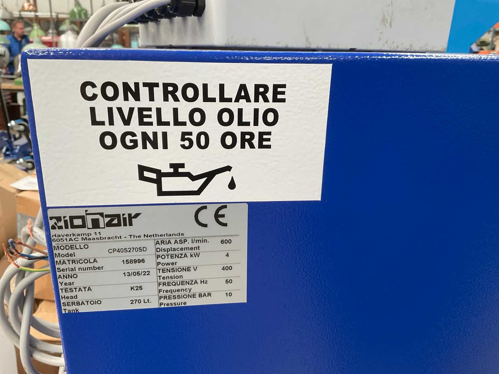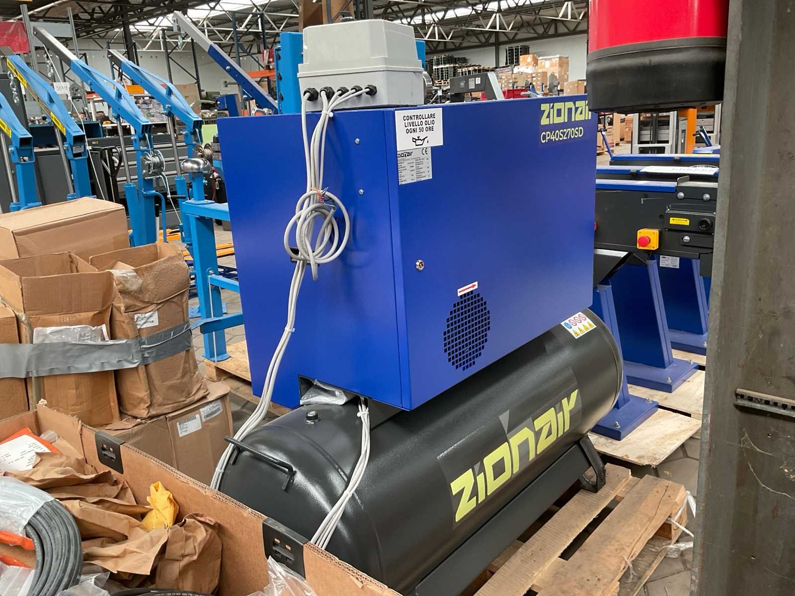 Merk: Zionair Type: CP40S270SD Bouwjaar: 2022 Capaciteit.: 10bar Luchtstroom: 600l/min Buffertank inhoud: 270l Totale afmeting L: 1500mm Totale afmeting Breedte: 570mm Totale afmeting Hoogte: 1230mm