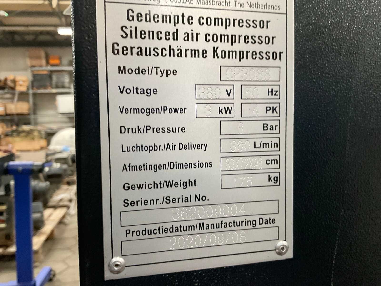 Merk: Zionair Type: CP308S Capaciteit.: 8bar Aansluiting: 380V Totale afmeting L: 800mm Totale afmeting Breedte: 700mm Totale afmeting Hoogte: 1000mm