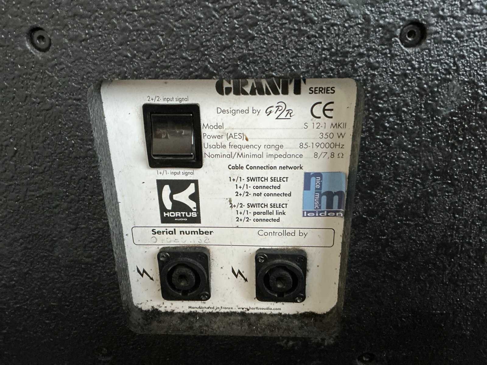 Bestaande uit 2x Subwoofer dubbel 15” , 2x Top 12” 1” driver, Chevin versterkerrack met 19” aansluitpaneel, Aztek Da Vinci 6 processor en 2 versterkers. In totaal 4 flightcases. Voorzien van kabels. Merk: Hortus Audio Type: 5KW
