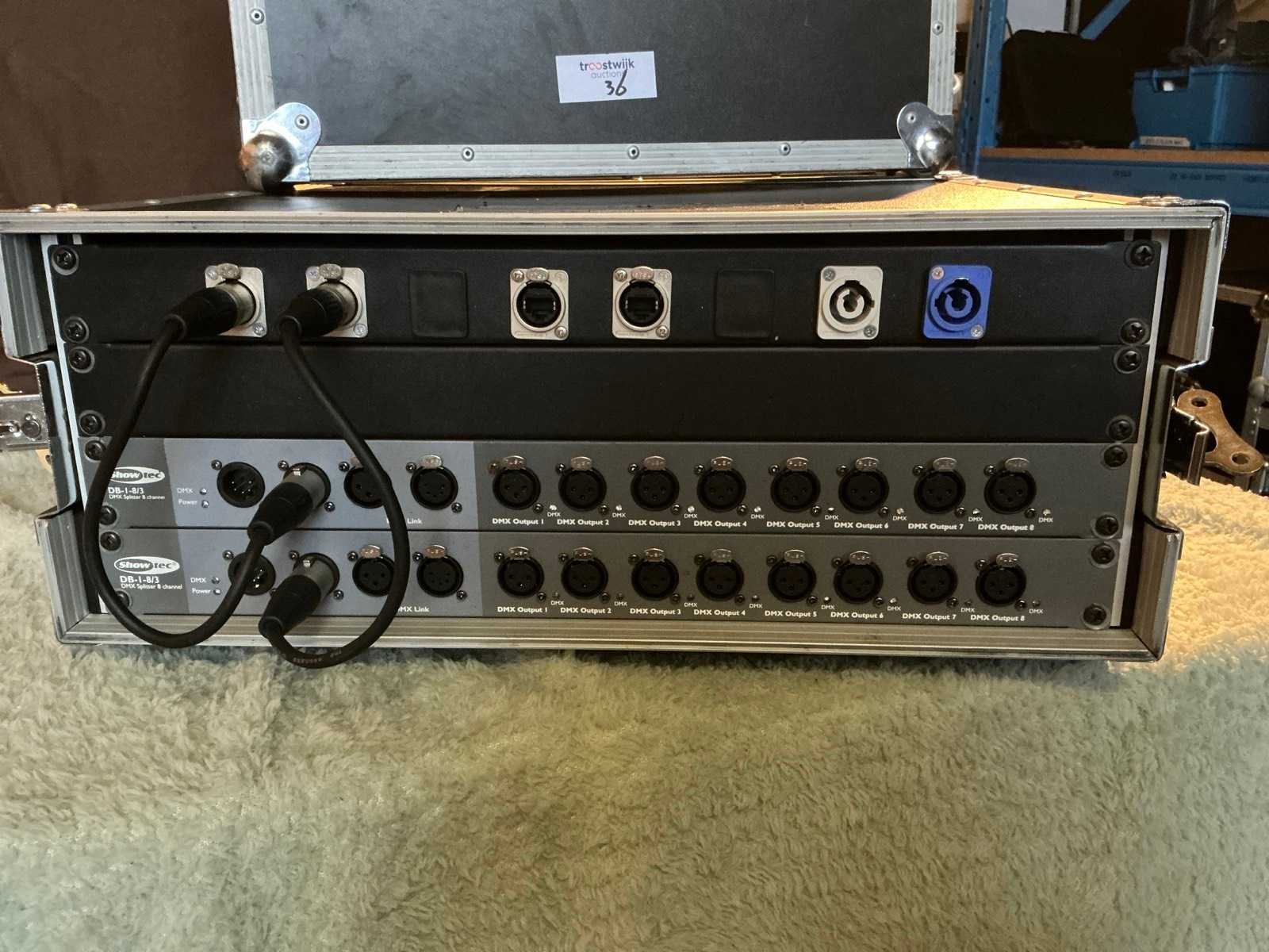In flightcase met 19” aansluitpaneel. Merk: Showtech Type: DB-I-8/3