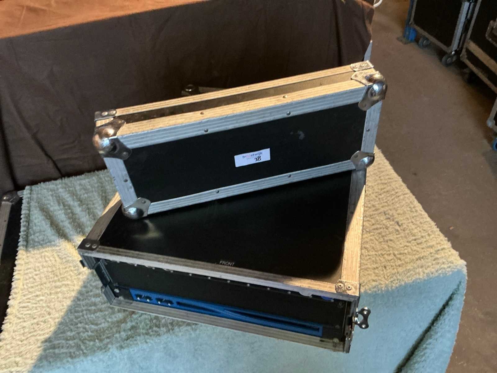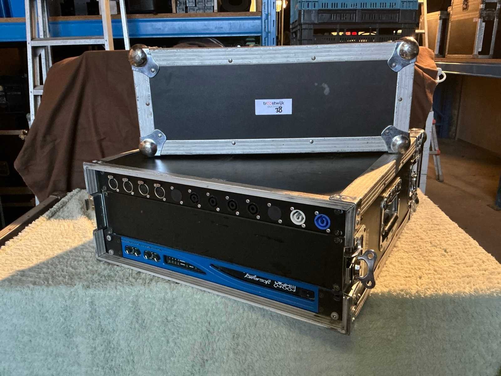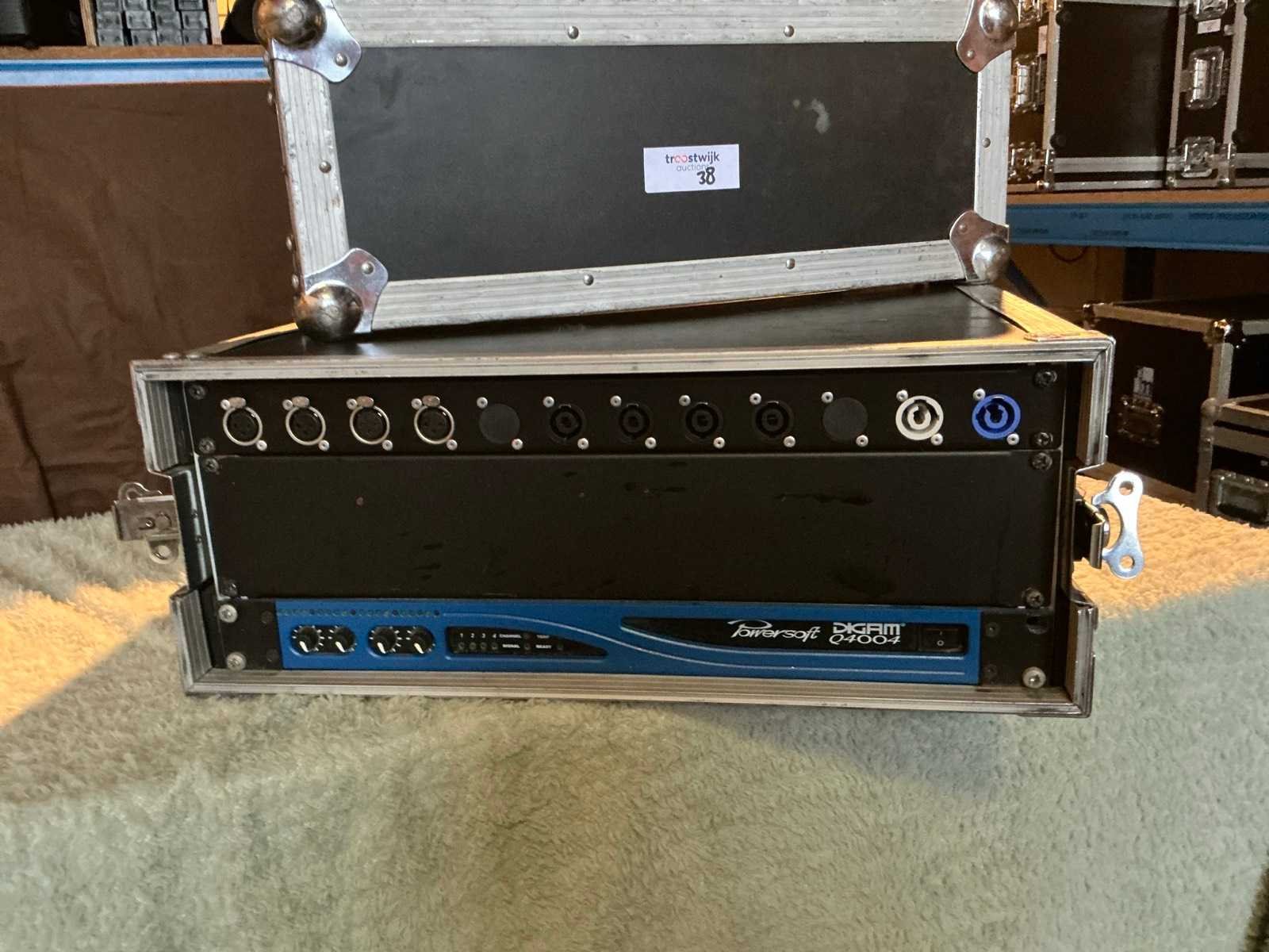 In flightcase met 19” aansluitpaneel. Merk: Powersoft Type: Digam Q4004