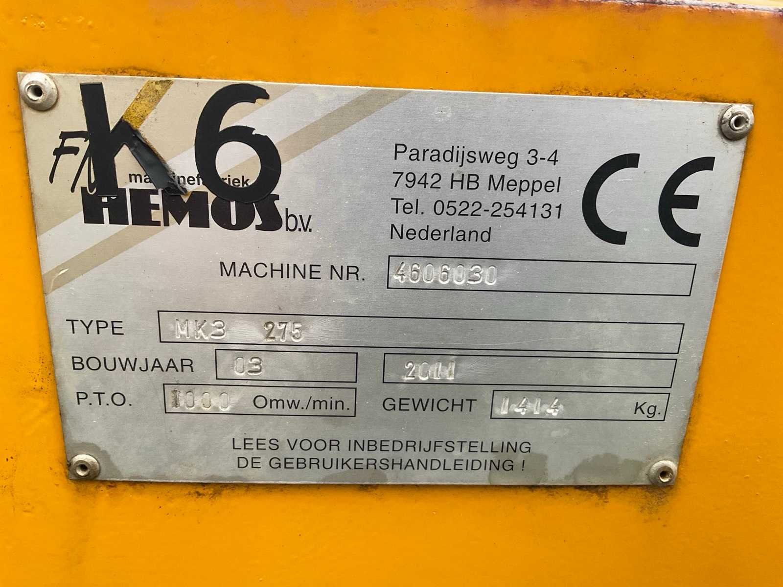 3-punts gedragen, aftakas aangedreven, inclusief aftakas Merk: Hemos Type: MK3 Bouwjaar: 2012 Serienummer: 4606030 Gewicht: 1414kg Totale afmeting L: 1200mm Totale afmeting Breedte: 5000mm Totale afmeting Hoogte: 1600mm