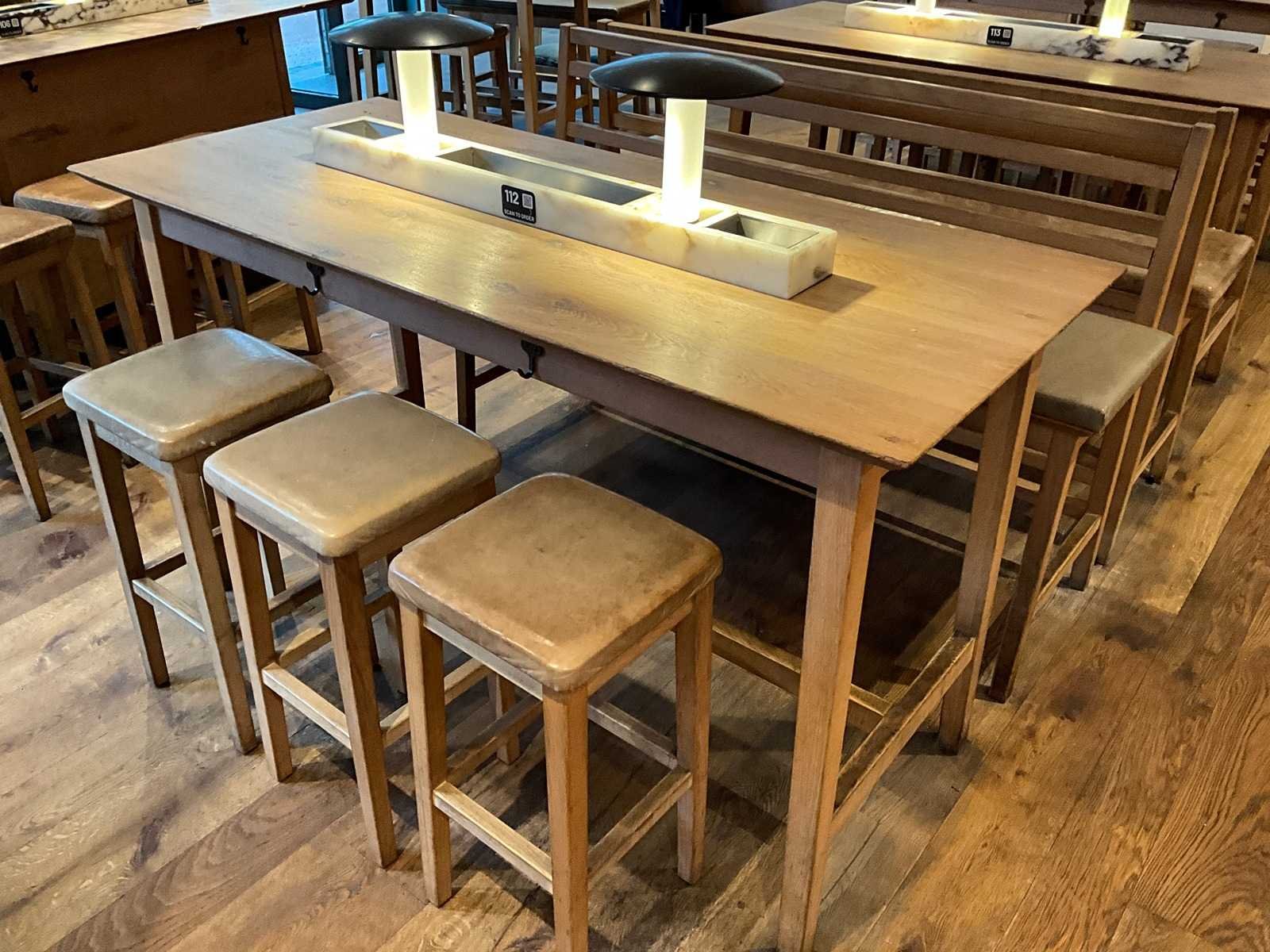 Bartafel met marmeren opbouw en verlichting. Afmeting bank: 180x50x112 cm, zithoogte 75 cm. Afmeting krukken 37x37x75 cm. De tafel is reeds ontkoppeld van de vloer en elektra. Hiervoor zijn de additionele kosten van toepassing. Merk: Hutten Totale afmeting L: 1800mm Totale afmeting Breedte: 800mm Totale afmeting Hoogte: 1050mm Hout: true