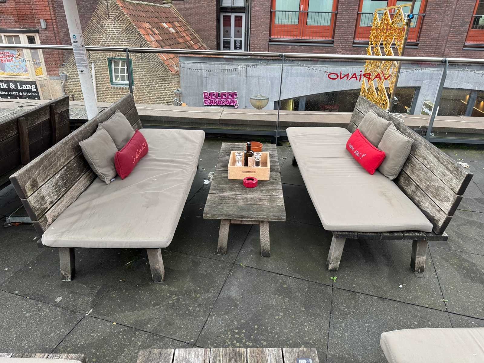 2 Banken met kussens een houten tafel LET OP! Kavel bevindt zich op het dakterras. Merk: Hutten