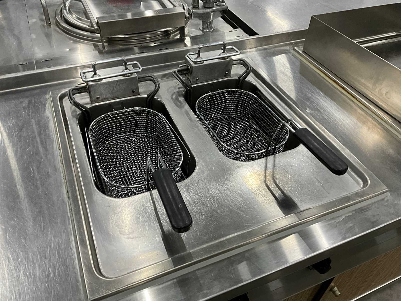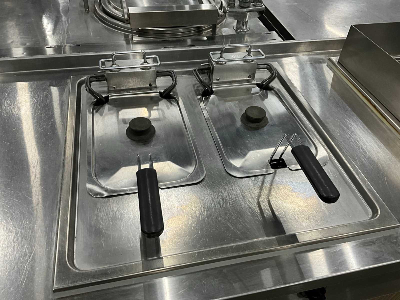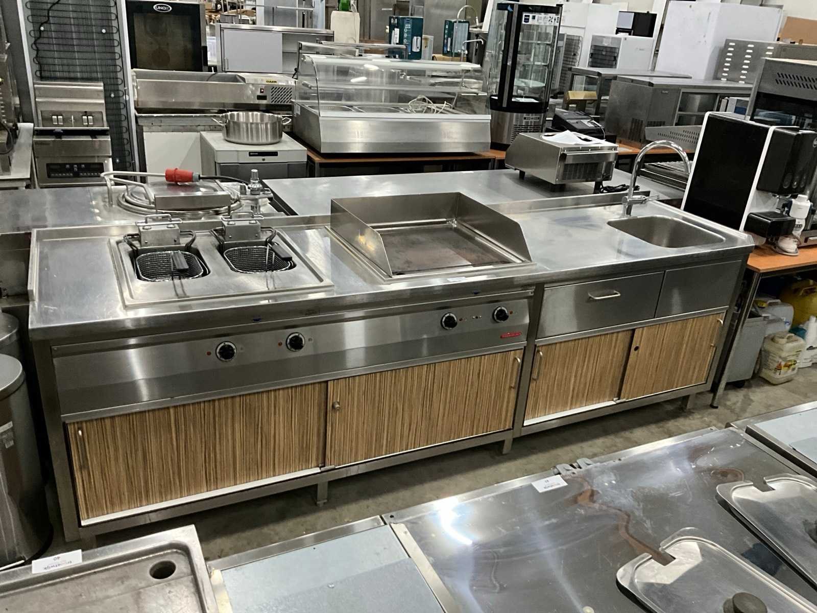 Voorzien van dubbele friteuse, bakplaat en spoelbak met kraan. Merk: Küppersbusch Totale afmeting Breedte: 2860mm Totale afmeting L: 760mm Totale afmeting Hoogte: 900mm