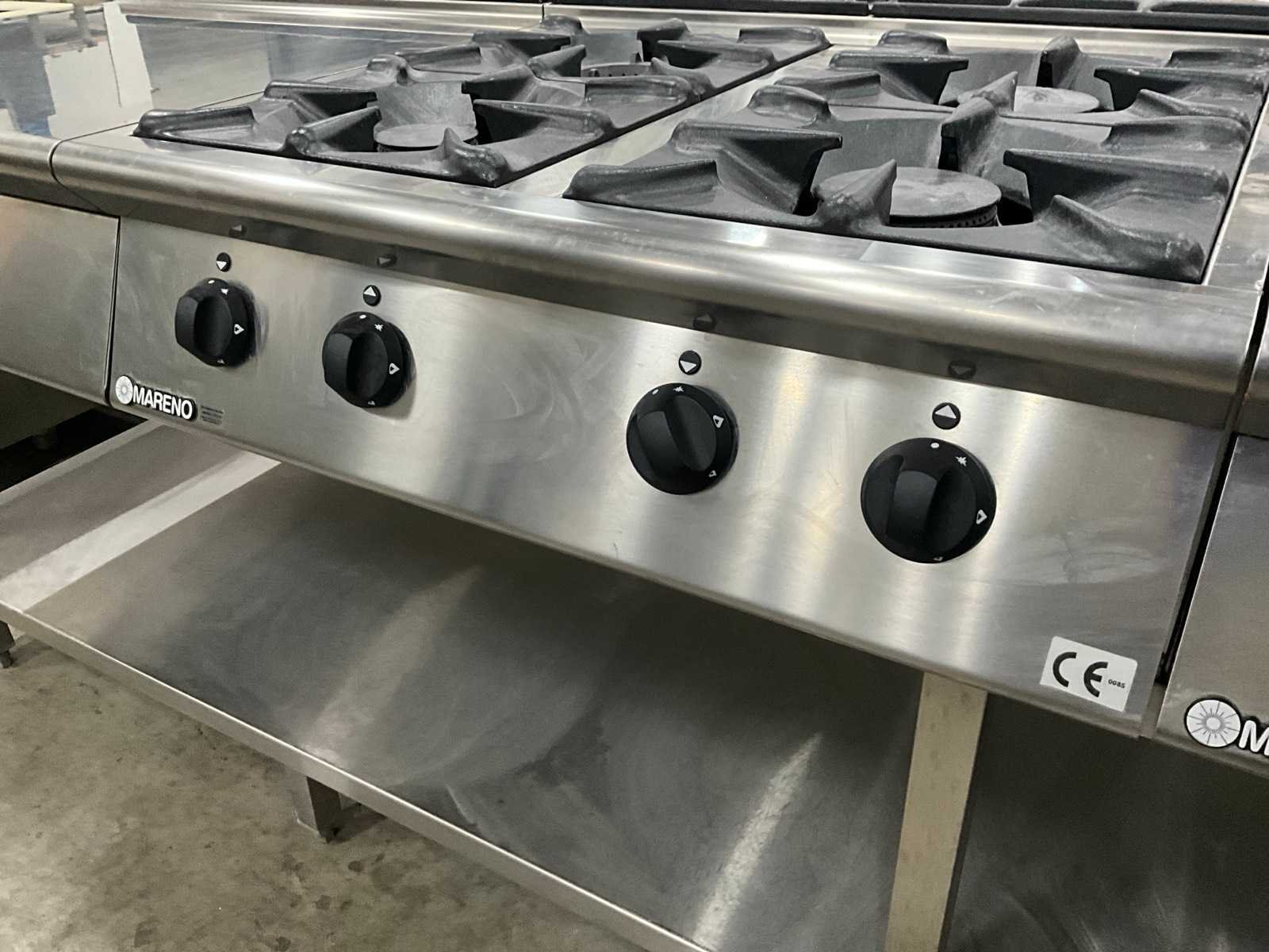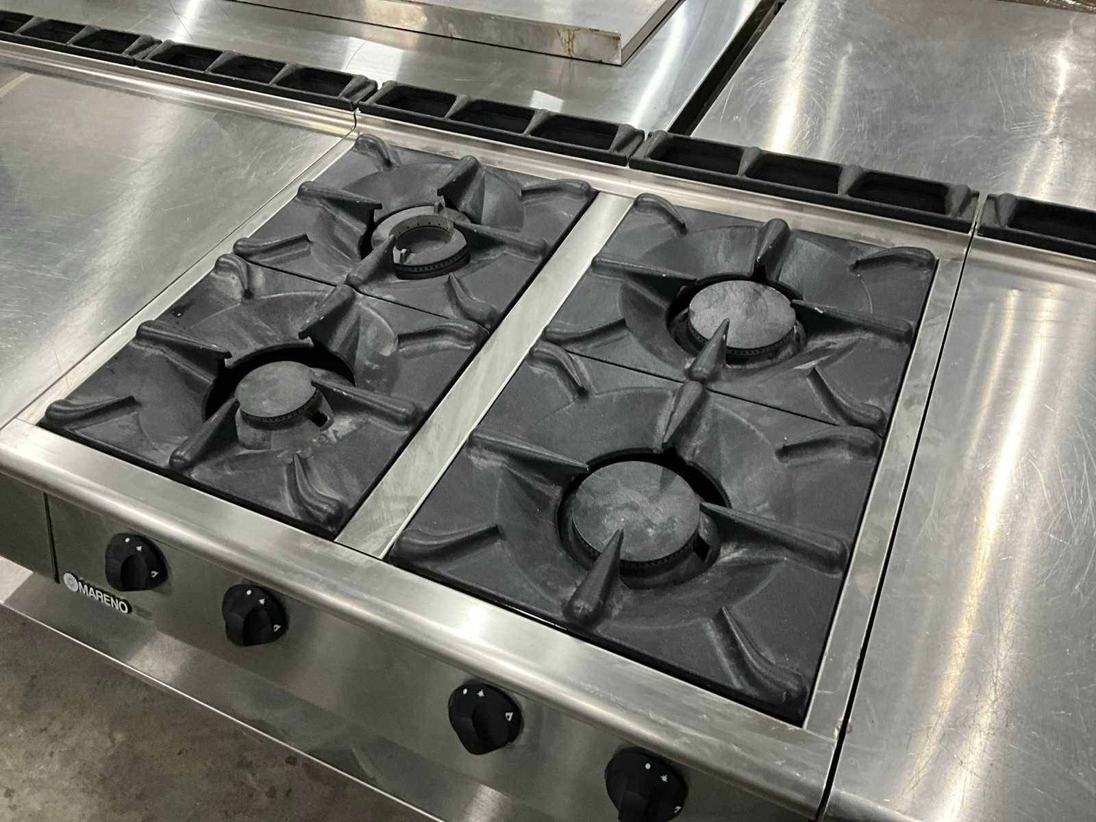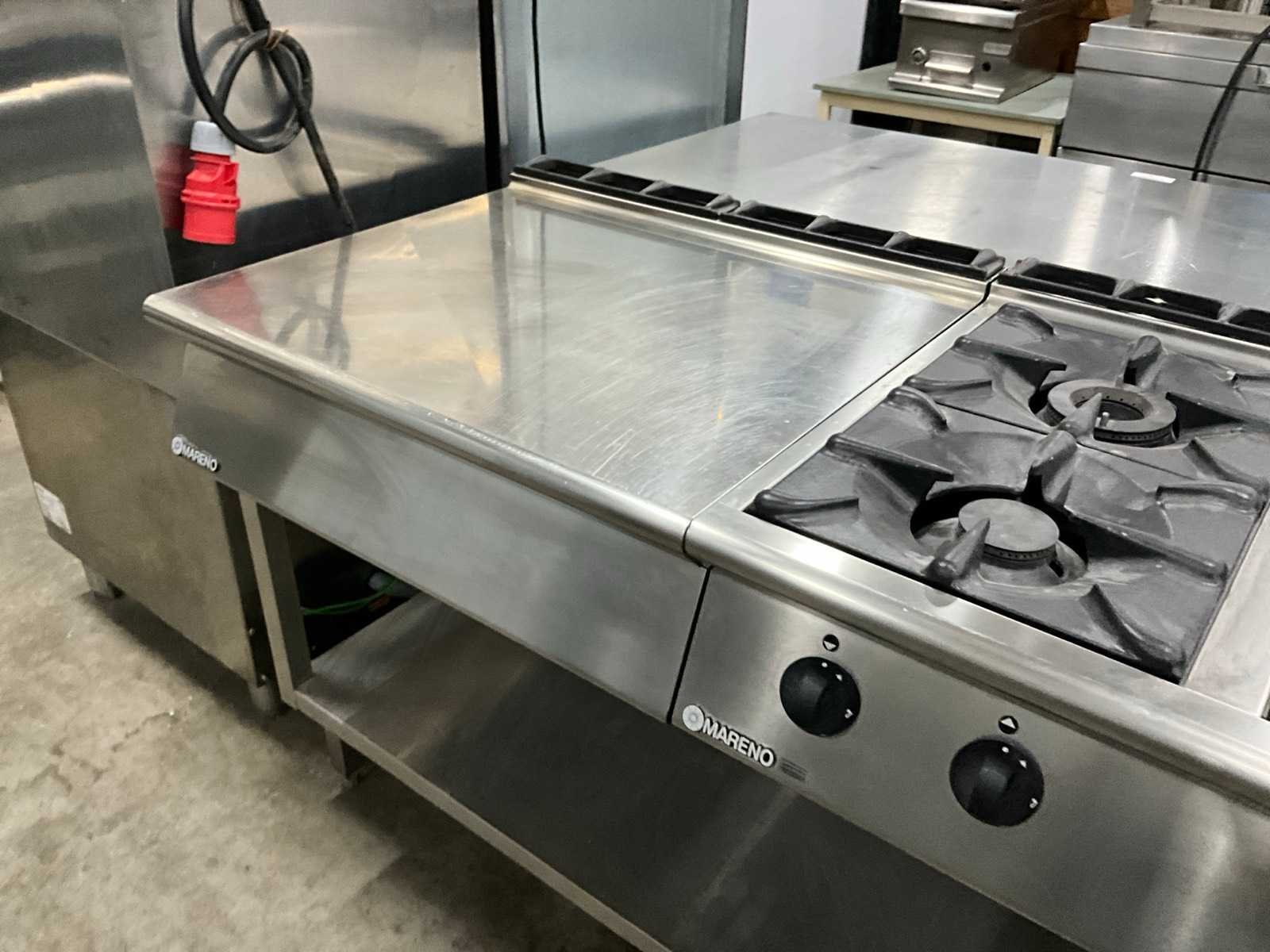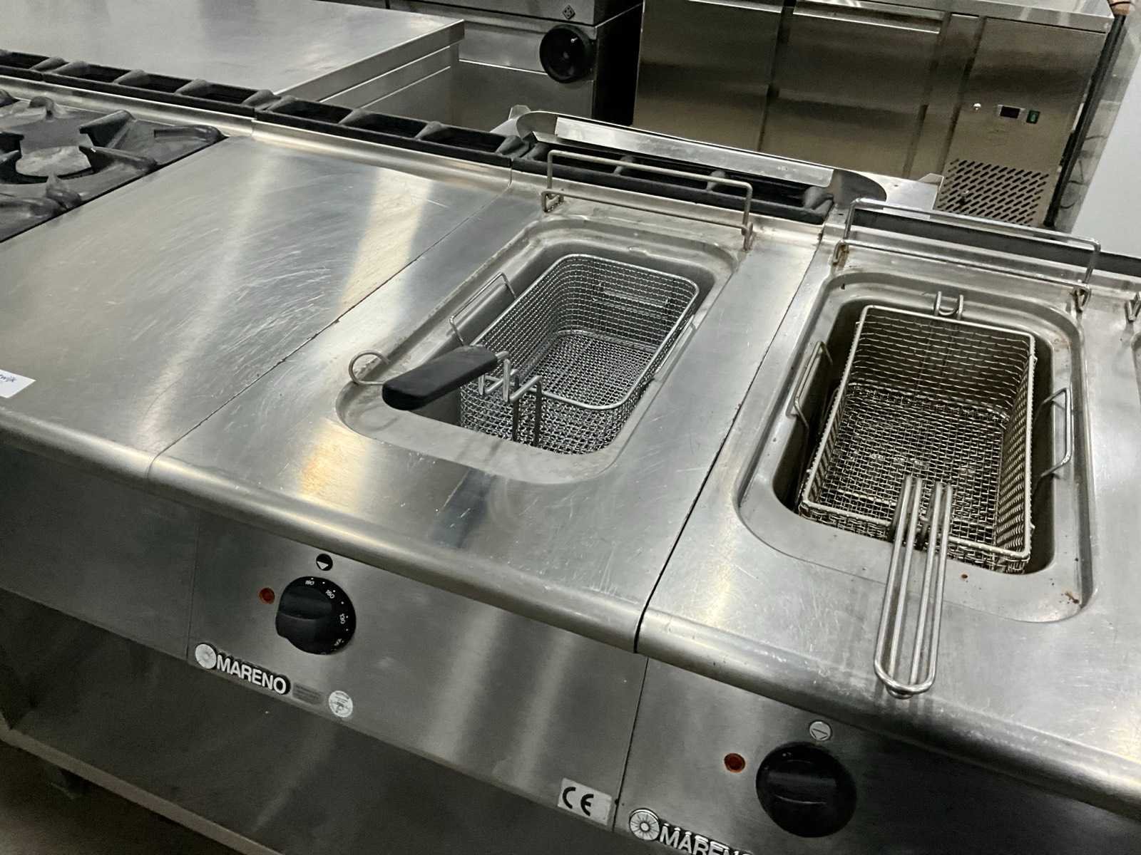 Voorzien van 4-pits gasfornuis en 3x elektrische friteuse; waarvan 2 x met snackcomputter ; 4 x neutrale unit met lade. Merk: Mareno Model: 07859 Materiaal: rvs Totale afmeting Breedte: 3410mm Totale afmeting L: 750mm Totale afmeting Hoogte: 900mm