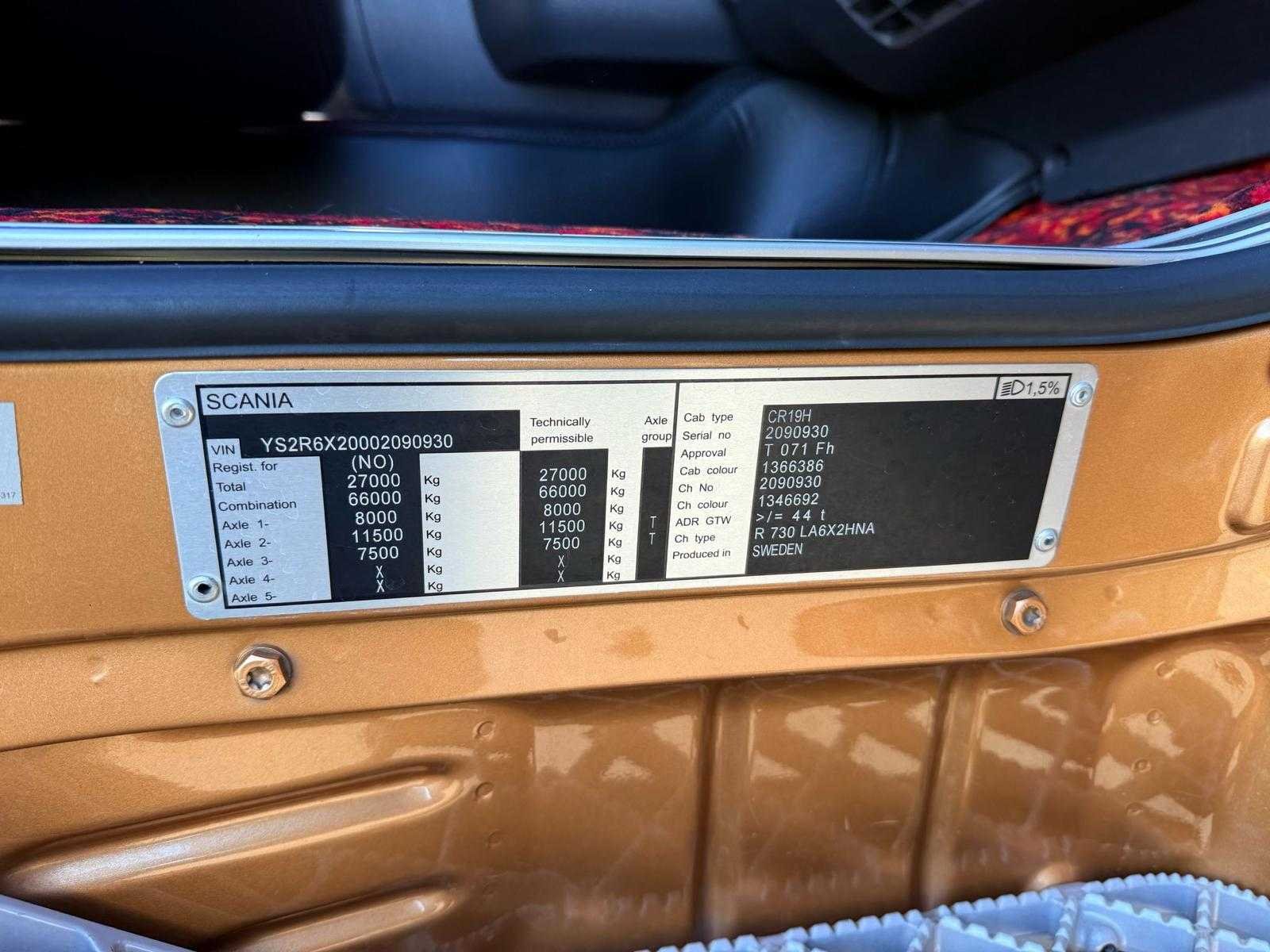 Kenteken: 61-BST-4 Merk: Scania Type: R730 Bouwjaar: 2013 Chassisnummer VIN: YS2R6X20002090930 Cilinderinhoud: 16350cc APK vervaldatum: 2025-03-01 Datum eerste toelating: 2013-11-13 Datum eerste toelating (NL): 2022-04-04 Fuel Type: Diesel Laadvermogen: 17170kg Emissieklasse: 5 Slaapcabine: true Afgelezen kilometerstand: 738318km Nationaliteit documenten: NL Aantal zitplaatsen: 2