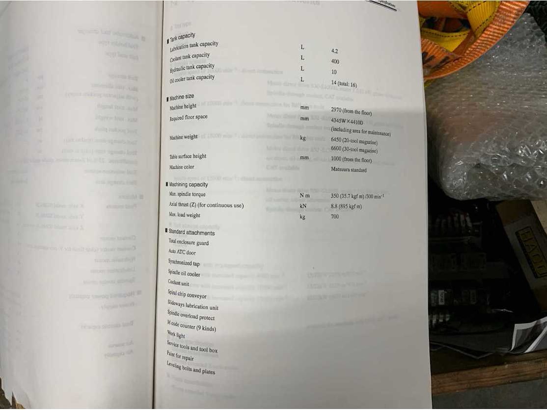 Let op!! uitlevering 15 December Merk: Masuura Type: MC-800 VG Bouwjaar: 1998 Serienummer: 980713212 Opname iso: JOS B 6339 tool scank 40T Verplaatsing x-as: 800mm Verplaatsing y-as: 510mm Verplaatsing z-as: 510mm Snelheid van n =: 30rpm Snelheid tot n =: 8000rpm Werkstuk gewicht max.: 700kg T-gleuf opspantafelafmeting B: 510mm T-gleuf opspantafelafmeting L: 1150mm Aansluiting: 400V Totale afmeting Hoogte: 2970mm Totale afmeting Breedte: 4245mm Totale afmeting L: 4410mm Machinegewicht: 6400kg
