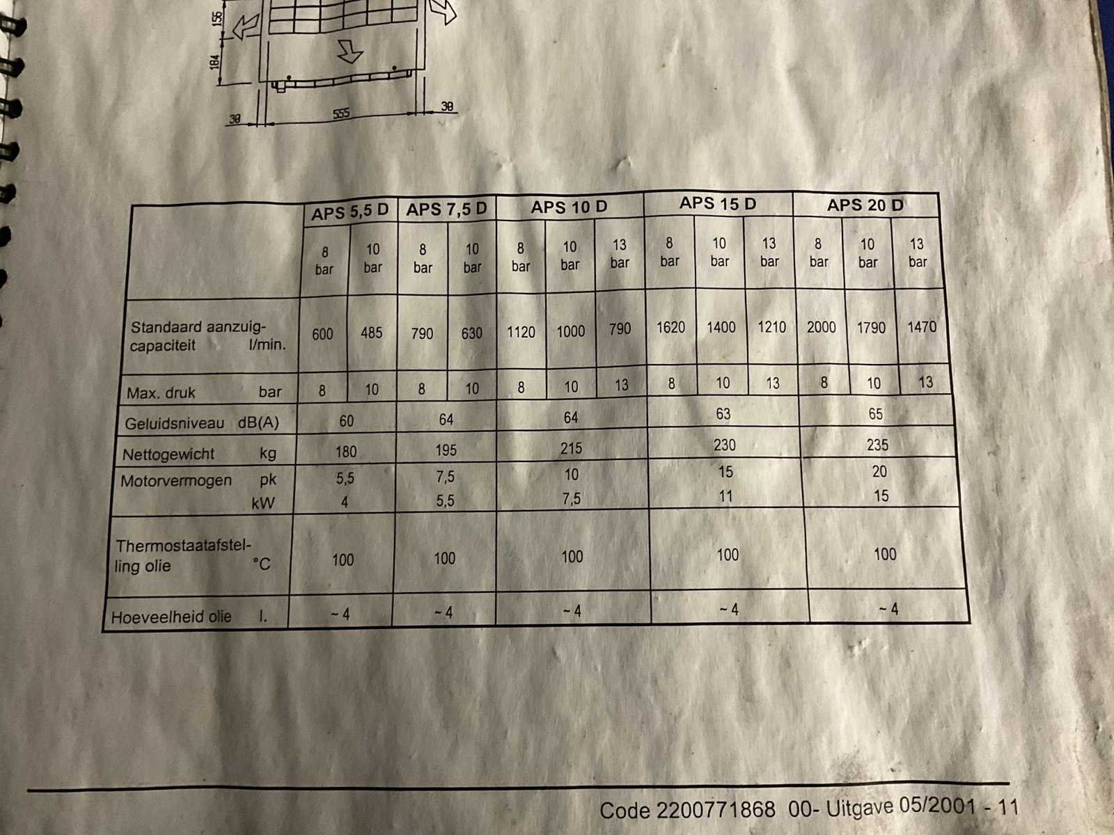Merk: Airpress Type: APS7.50/10 Bouwjaar: 2002 Serienummer: CAI048646 Capaciteit.: 10bar Luchtstroom: 630l/min Vermogen: 5.5kW Afgelezen urenstand: 40950 Aansluiting: 400V Eigen gewicht: 150kg Totale afmeting L: 960mm Totale afmeting Breedte: 610mm Totale afmeting Hoogte: 1050mm