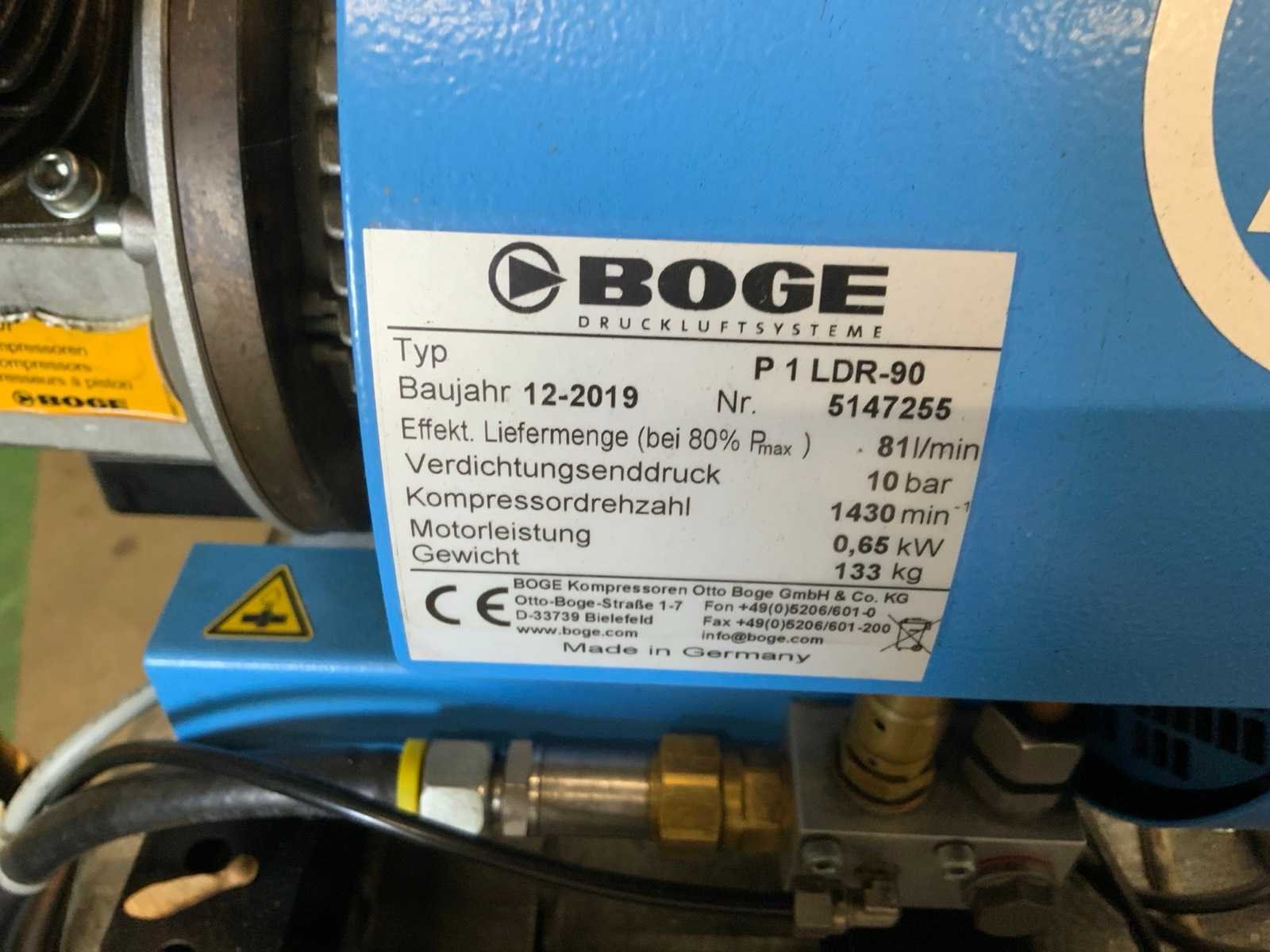 Merk: Boge Type: P 1 LDR-90 Bouwjaar: 2019 Serienummer: 5247255 Capaciteit.: 10bar Luchtstroom: 81l/min Vermogen: 0.65kW Buffertank inhoud: 90l Afgelezen urenstand: 298hr Luchtdroger: true Aansluiting: 230V Totale afmeting L: 1460mm Totale afmeting Breedte: 760mm Totale afmeting Hoogte: 1150mm