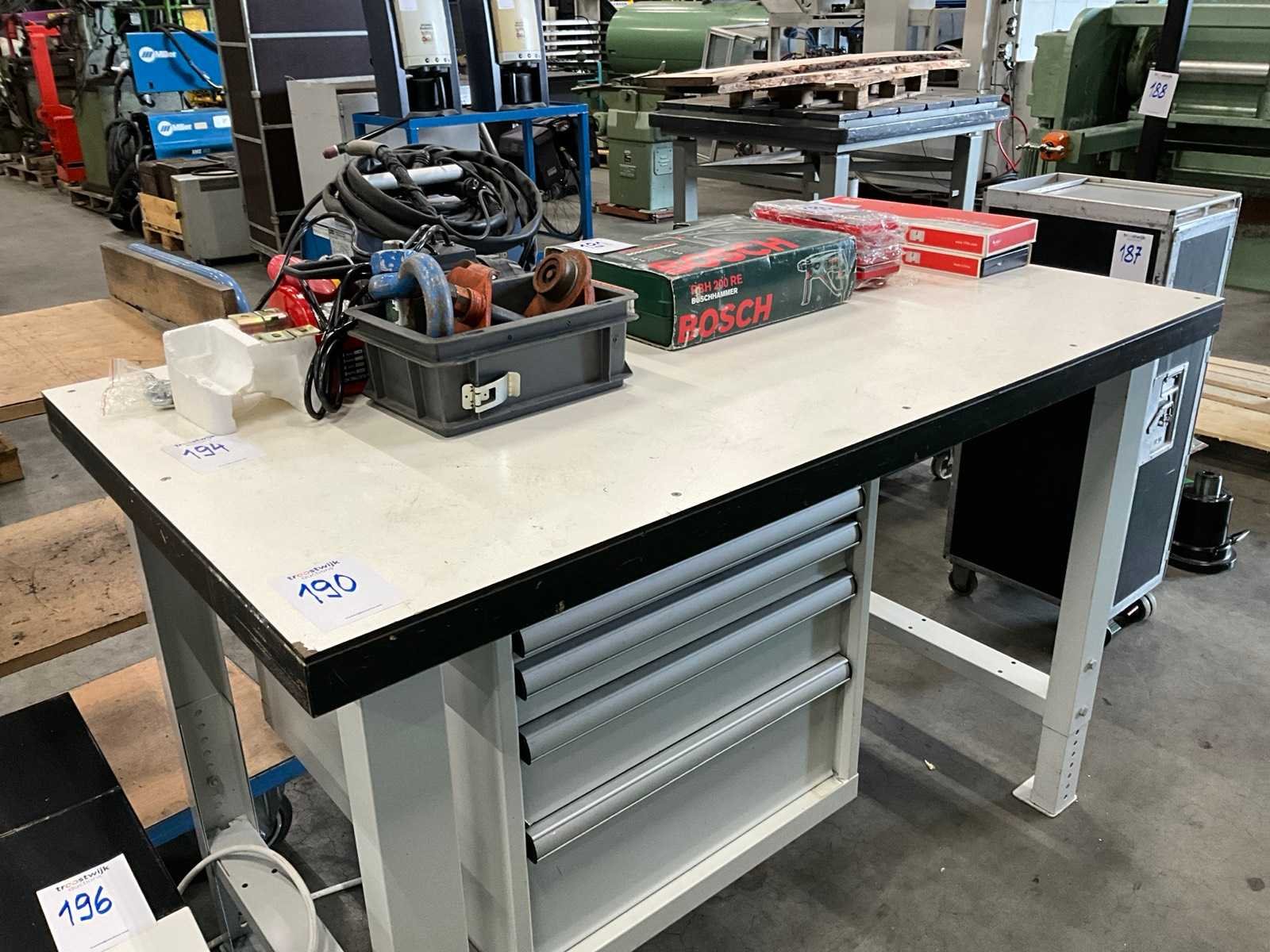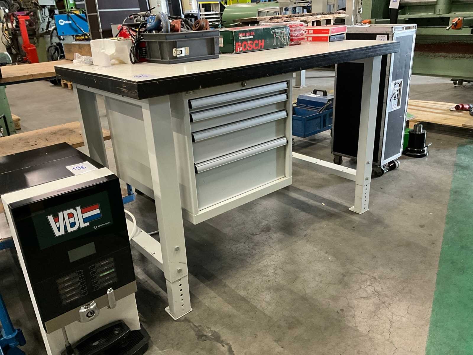 Profielstaal onderstel; voorzien van 4 ladenkast; in de hoogte verstelbaar; volkern tafelblad; zonder artikelen op de tafel; afmeting 1500x800x980 mm;