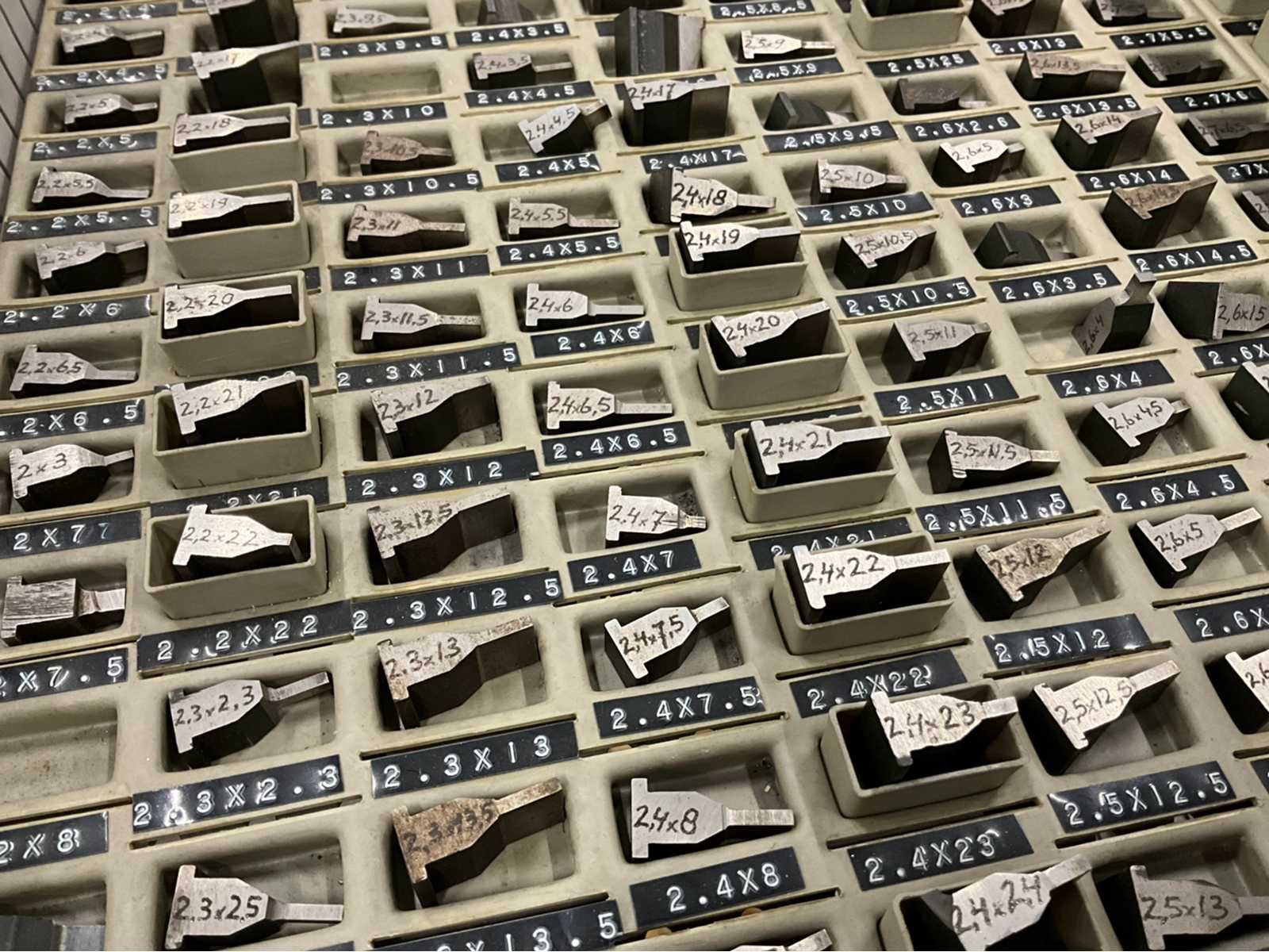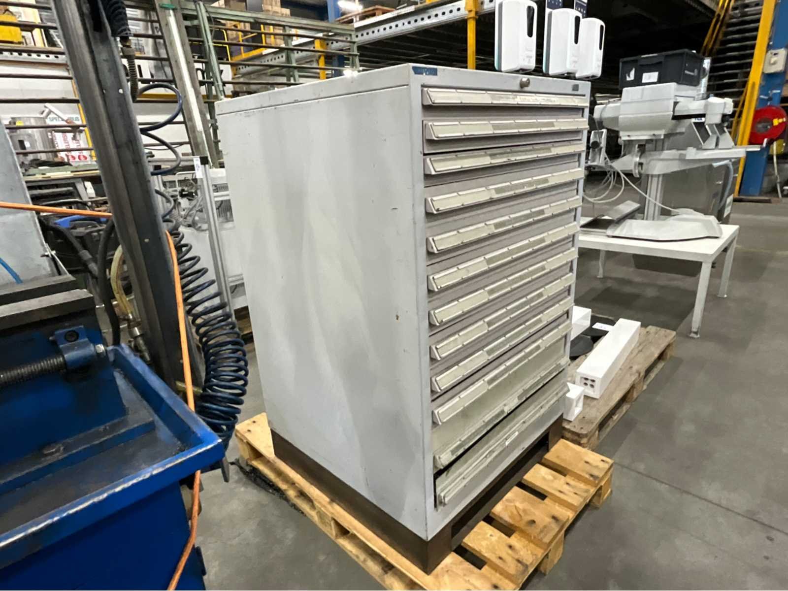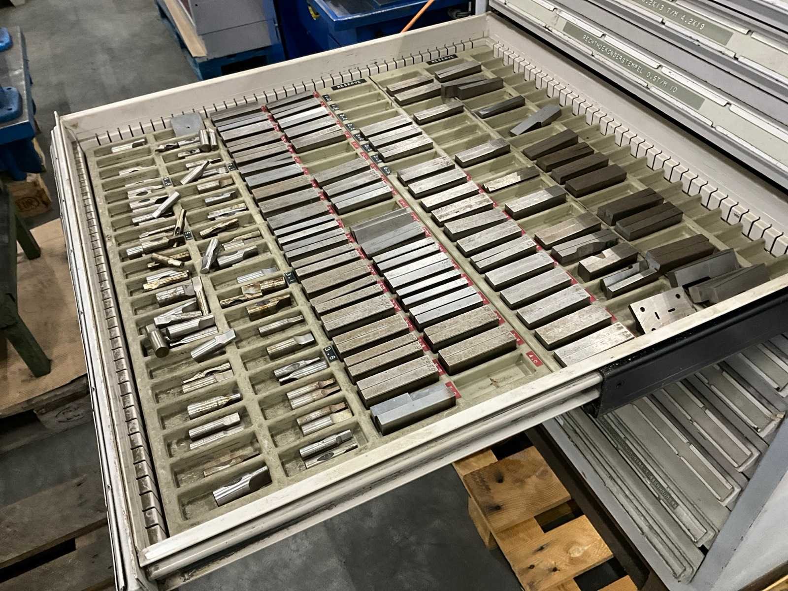 Staal; voorzien van 12 laden; inclusief grote partij stempels diverse afmetingen (rechthoekig / ovaal); Lengte: 76cm Breedte: 80cm Hoogte: 120cm