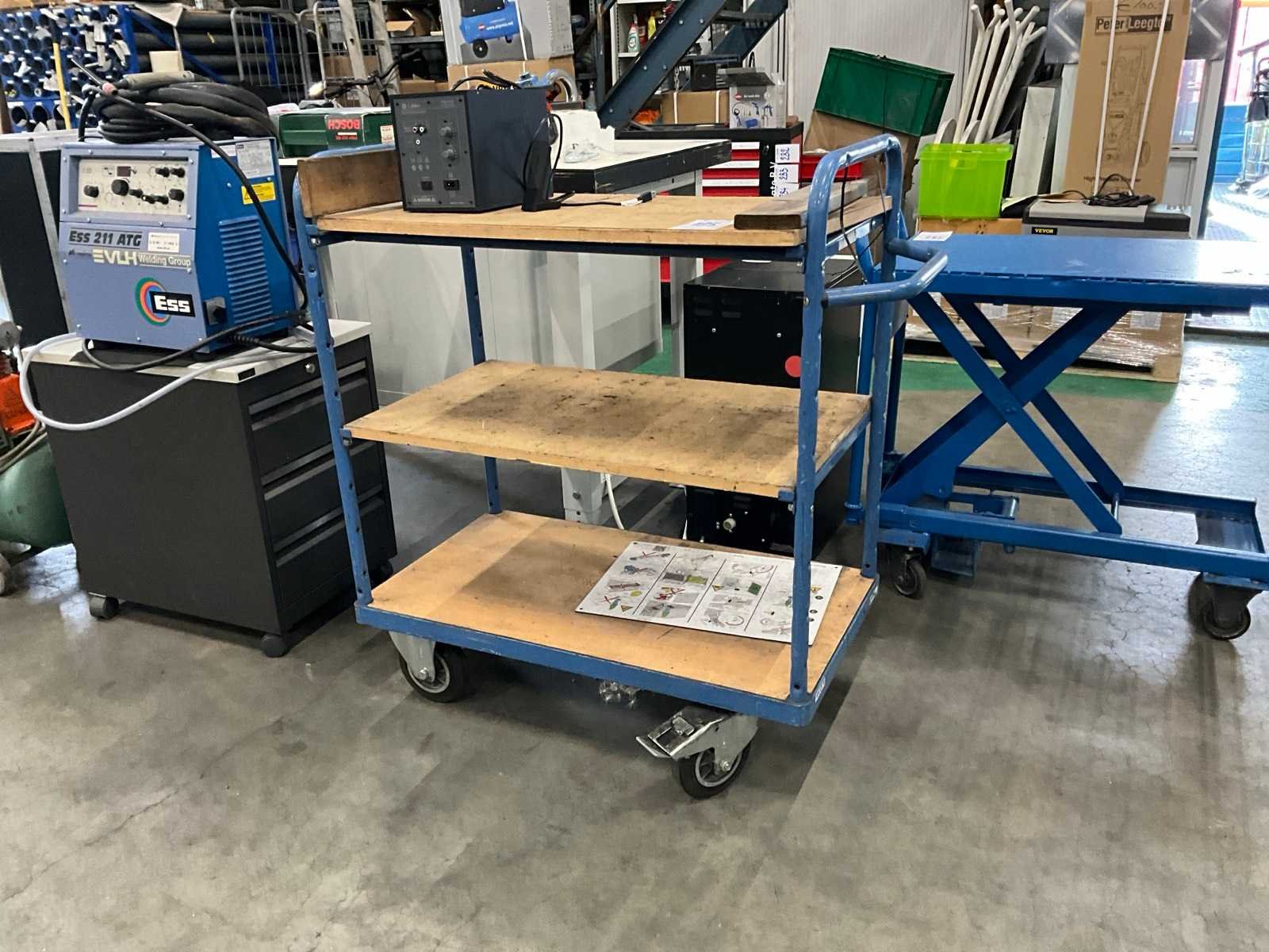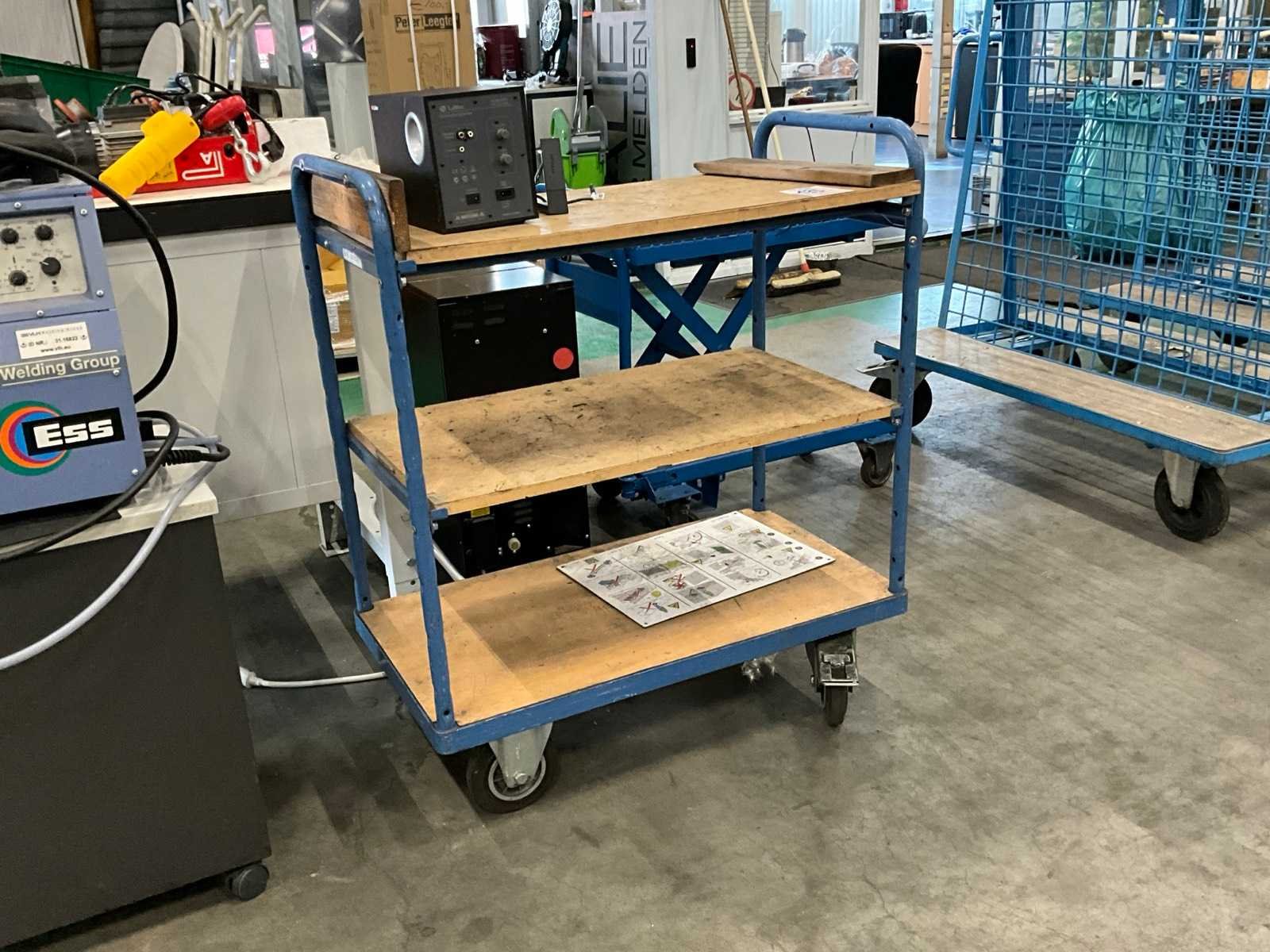 Verrijdbaar; profielstaal frame; voorzien van 3 gelamineerde legborden; duwbeugel; afmeting 1000x500x1100 mm