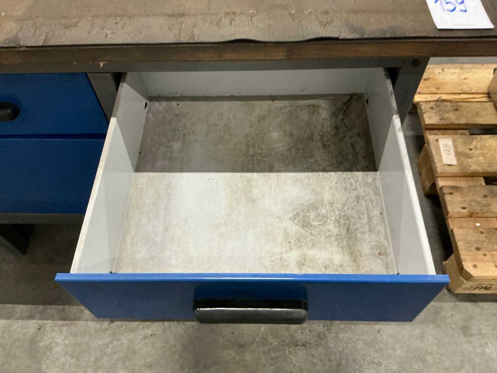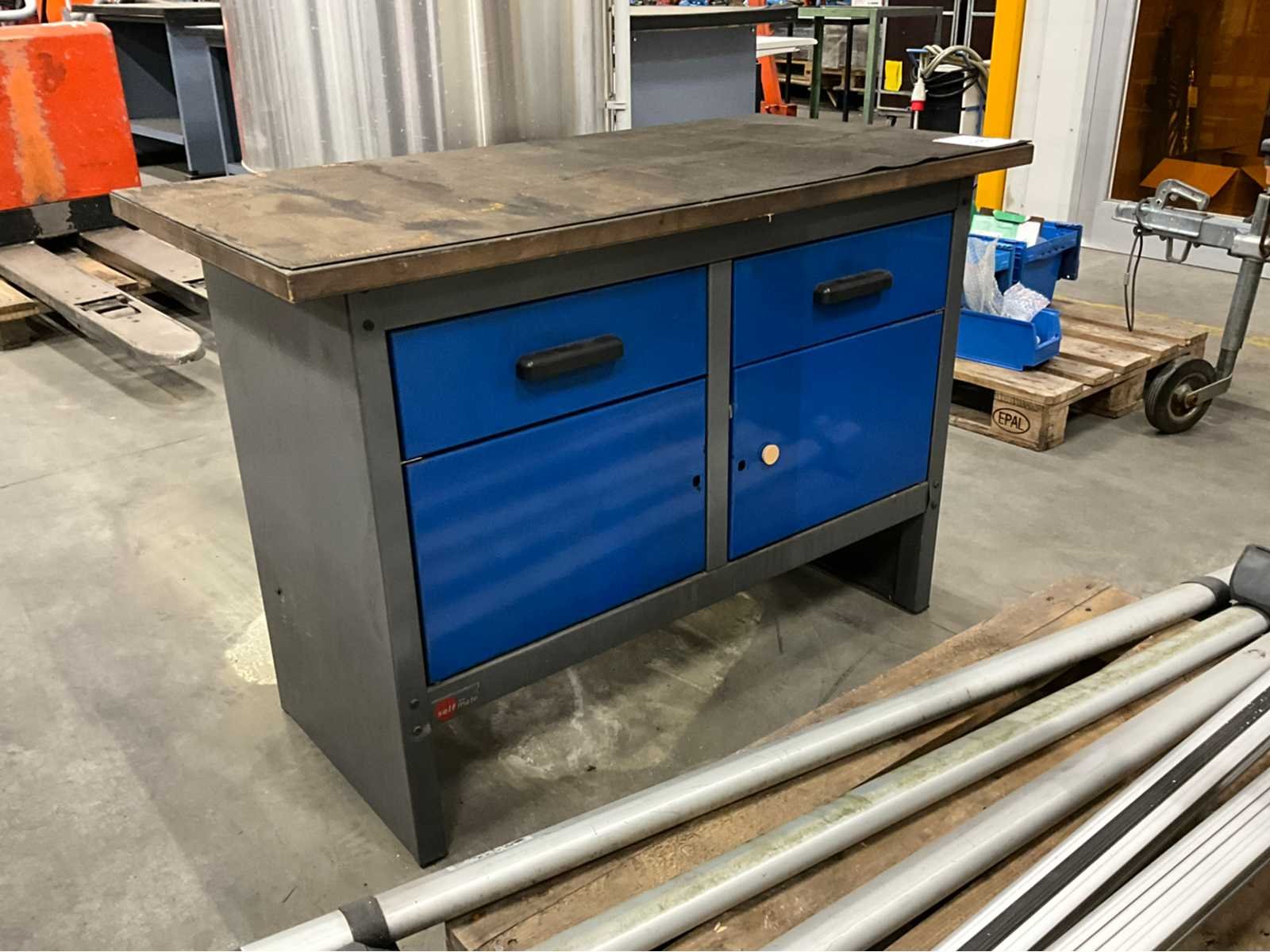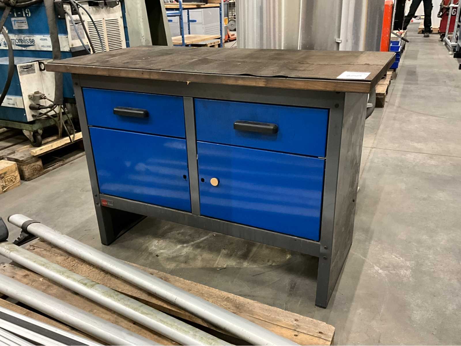 Staal; multiplex tafelblad; voorzien van 2x lade en 2x deur; Breedte: 600mm Lengte: 1200mm Hoogte: 820mm