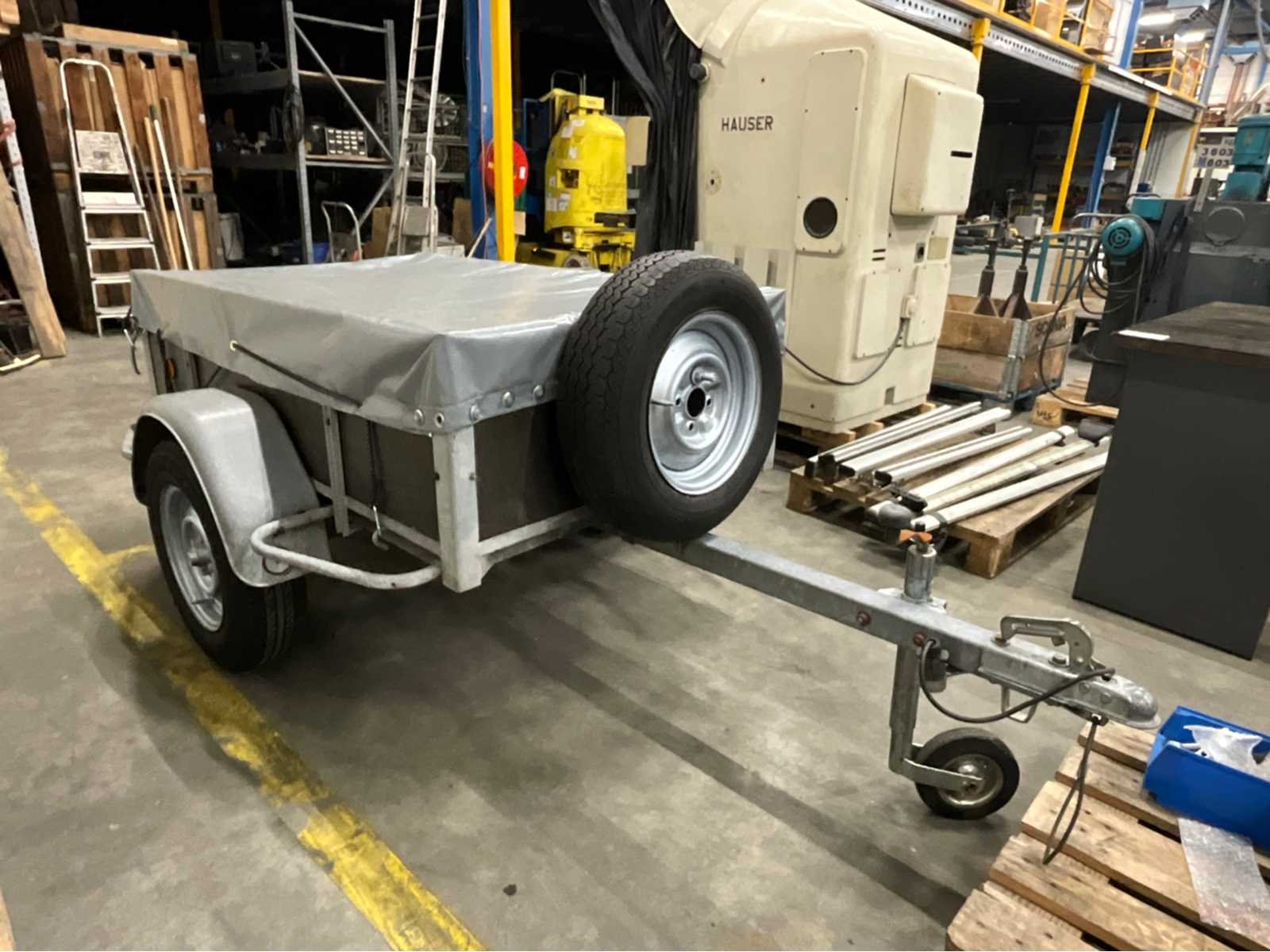 Gegalvaniseerd staal onderstel; hout schotten; afdekzeil; reservewiel; neuswiel; zonder identificatie plaatje; niet registratie plichtig; Aantal assen: 1 Laadbak afmeting l: 155cm Laadbak afmeting b: 95cm Hoogte: 110cm Lengte: 270cm Breedte: 145cm