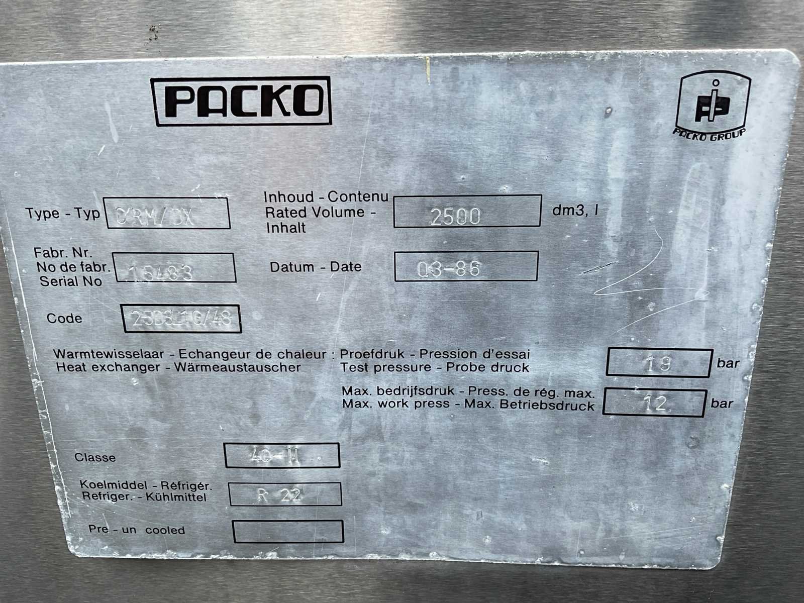Volume 2500 liter, inclusief spoelinstallatie, zonder koelinstallatie. Merk: Packo Type: CRM/DX Bouwjaar: 1986 Serienummer: 25D3L16/48 Totale afmeting L: 2800mm Totale afmeting Breedte: 1300mm Totale afmeting Hoogte: 2000mm