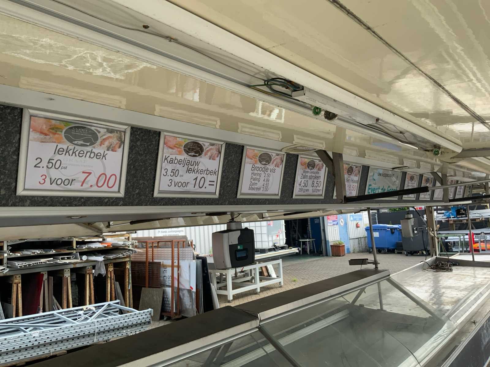 Inclusief toonbank met koeling, verlichting, 2 Avery Berkel digitale hangweegschalen, type: IM500, weegvermogen: min. 100 g / max. 15 kg, aansluiting 230 volt, voorzien van hydraulische radiografische mover met afstandbediening en tochtstroken Merk: Evers Type: EKB 353 Bouwjaar: 2002 Chassisnummer: W09A903351EE18444 Aantal assen: 3 Ledig gewicht: 4600kg Laadvermogen: 800kg Datum eerste toelating: 2003-01-27 Datum eerste toelating (NL): 2003-01-27 Kenteken: WG-ZD-87 Hoogte: 302cm Lengte: 900cm Breedte: 157cm